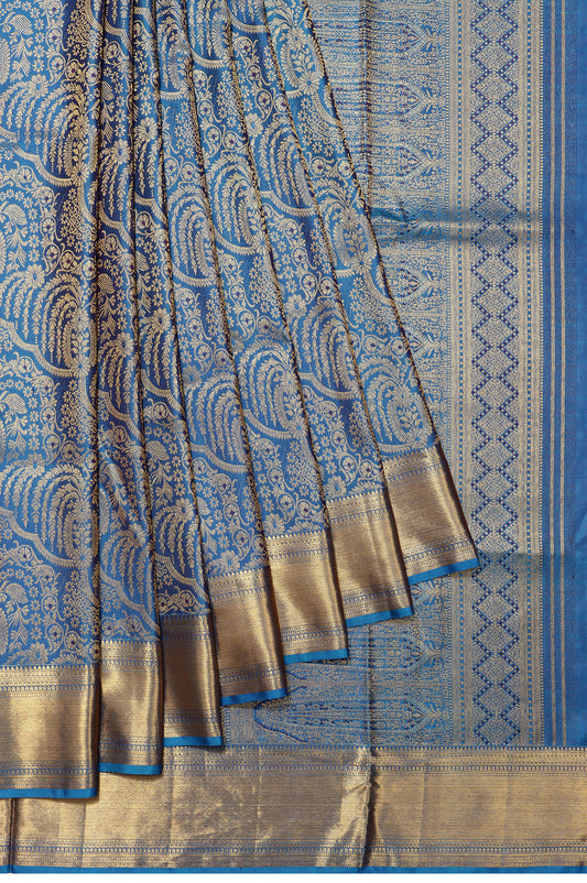 Though it assumes a unique Ananda blue colour, this Paithani Silk Saree smacks of tradition....