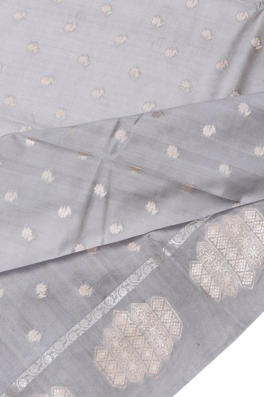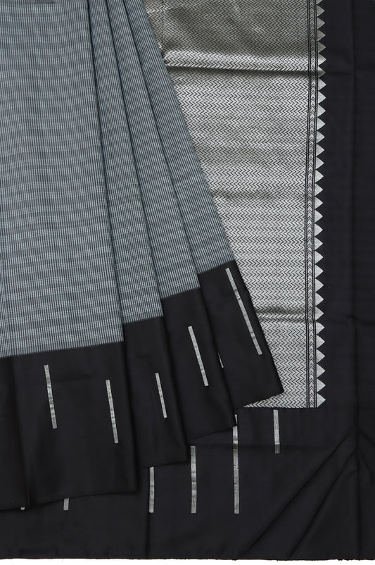 Drape yourself in elegance with this Ash Kanchipuram Saree, featuring Gold and Silver Zari in...