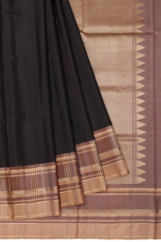 Embrace timeless elegance with this Black Kanchipuram Silk Saree, crafted with a traditional gold zari...