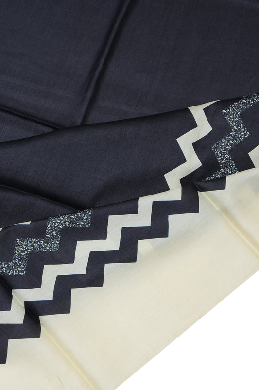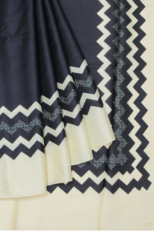 Description- This Blue Tussar Silk Saree features a cream wave design border and pallu, creating...