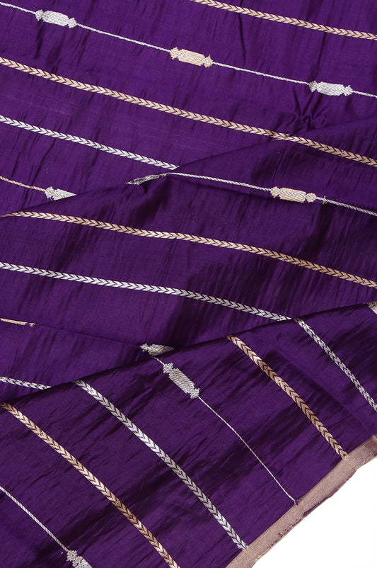 Description- Elegant and playful, this violet saree features a pink border with gold zari stripes...