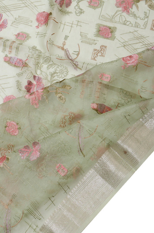 A graceful Pista Green Organza Silk saree, adorned with delicate floral and leaf prints, beautifully...