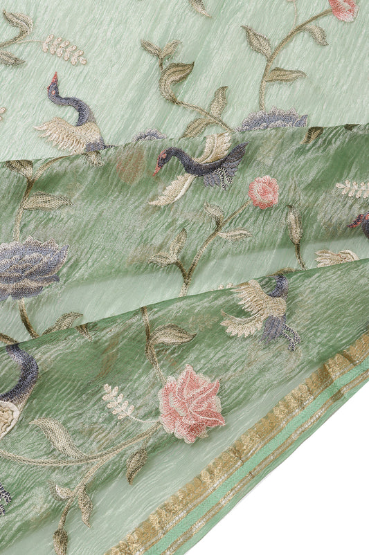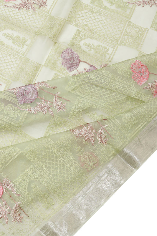 A light Pista Green Organza Silk saree, exquisitely adorned with all-over embroidery and intricate Meenakari...