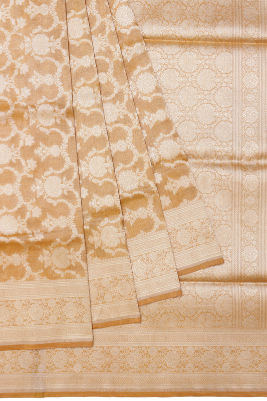 Exude regal charm with this Gold Kanchipuram Tissue Silk Saree, featuring all-over floral motifs and...