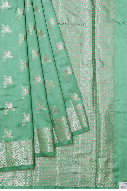Description- Green Banaras Organza Silk Saree unfolds history with its self-border adorned in majestic gold...