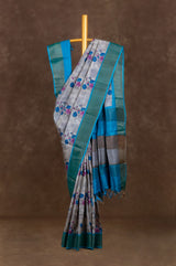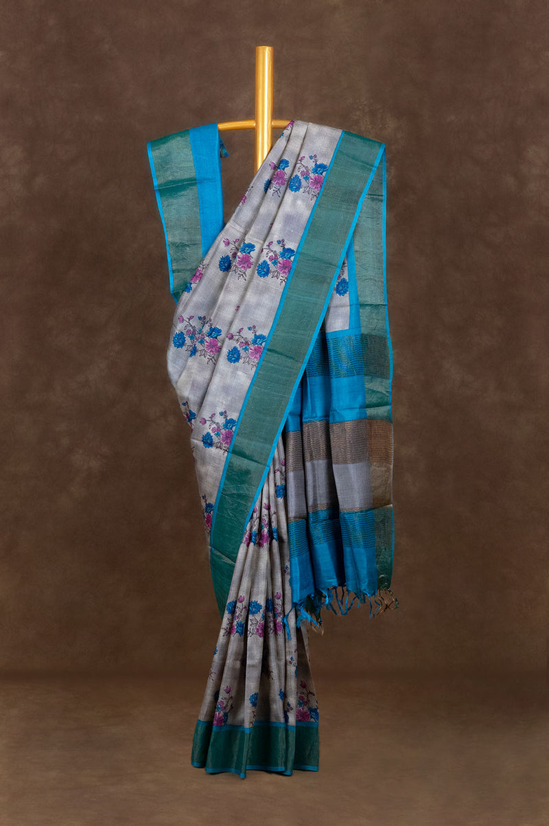 This ash coloured Tussar Silk Saree is pretty, showing some beautiful printed floral motifs. It effortlessly slips into the formal slot of your wardrobe. So you have one more ensemble to flaunt at any high end event. Zari work stands out on the kaddi border which dons sky blue colour. The pallu comes in both sky blue and ash colours with enchanting details like gold zari and raw silk stripes.