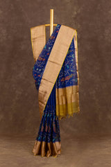 This navy blue Kota Silk Saree emerges as a very unique piece of art, wrapped in royal aura. Wear this exquisite saree and you are bound to be declared the queen of any event you grace. The body is filled with beautiful thread work and charming mayil (peacock)motifs. Border in mehendi colour sports the muted yet lustrous copper zari. Diamond and dot butta and flower design are its other components. The striped pallu also sports gold zari and tassels.
