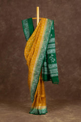 It is a classic case of Pure Silk Saree acquiring traditional and auspicious yellow tinge. The saree can be your choice to wear for any religious function or a social event. The understated leaf butta on the yellow background proves that there is beauty in subtlety. The green border shows ample details like floral creeper, flower and dot butta and thazhampoo reku. The pallu too flaunts all these components.