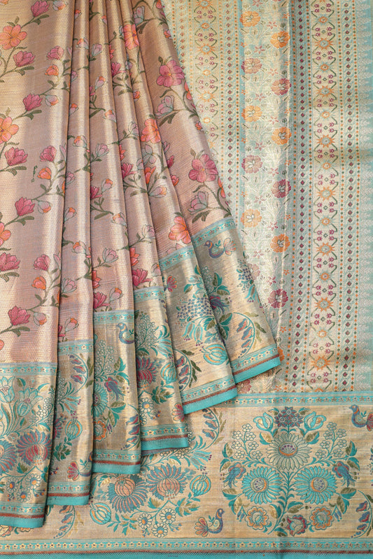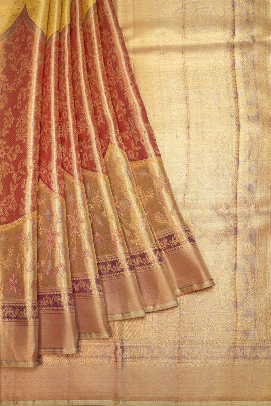 Radiate elegance with this Gold Kanchipuram Tissue Silk Saree, featuring an all-over floral jaal design...