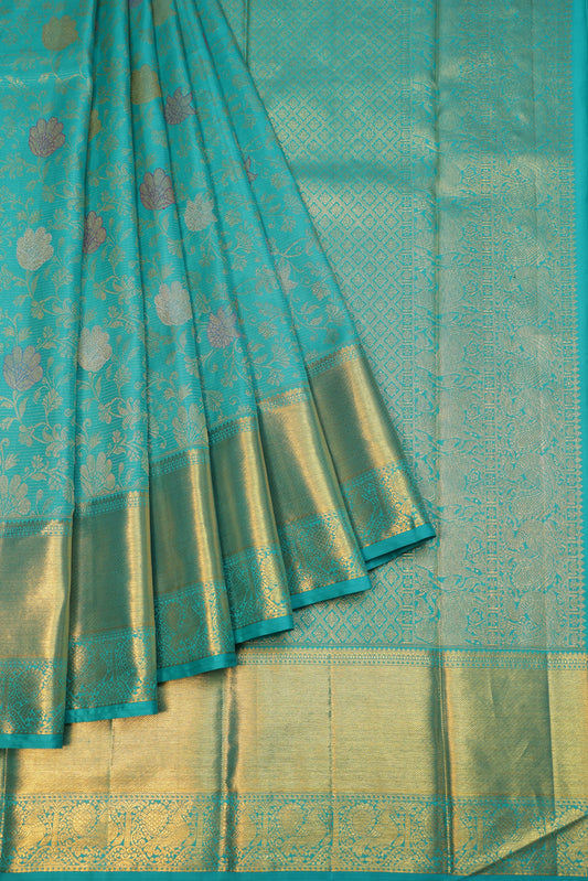 This Parrot Green Kanchipuram Tissue Silk Saree features a self-coloured body adorned with gold and...