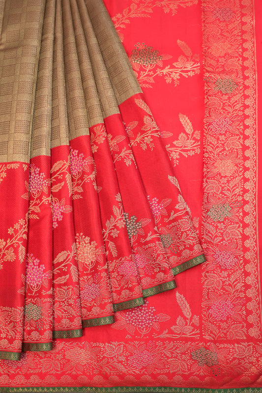 Celebrate tradition with this Red Kanchipuram Silk Saree, featuring all-over flower motifs and a gold...