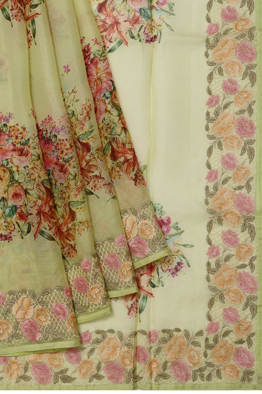 Bright and graceful, this Yellow Organza Saree features delicate floral motifs scattered across its airy...