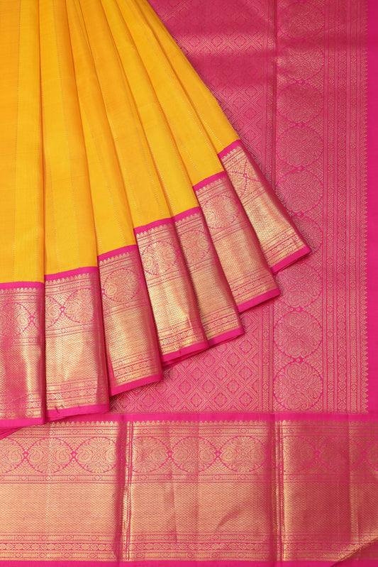 Description- This yellow Kanchipuram silk saree is reminiscent of a vibrant sunrise, blending sea green...