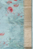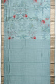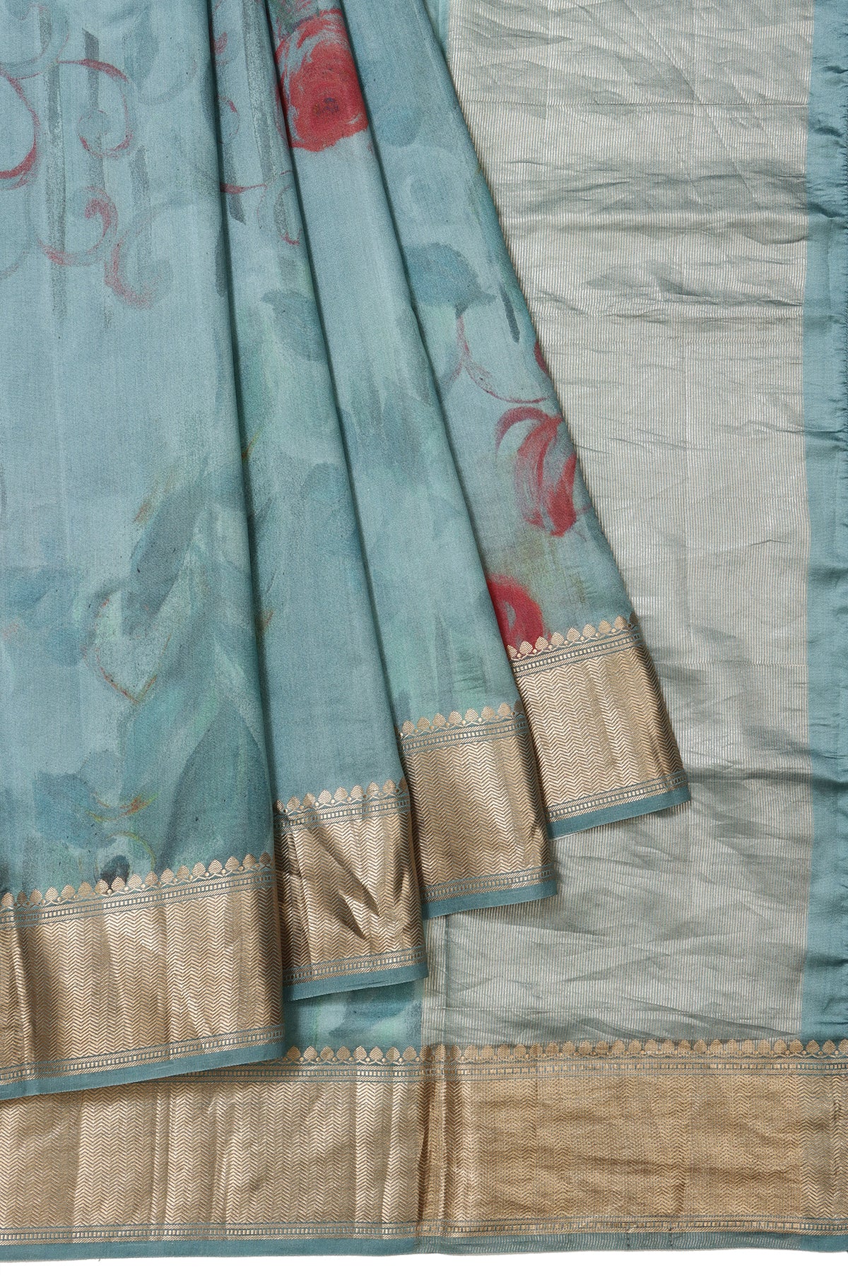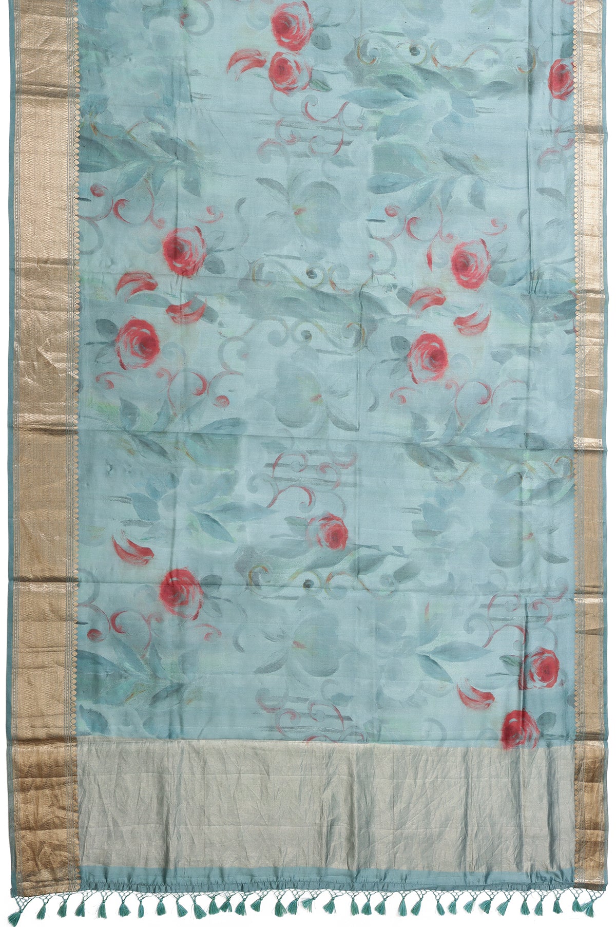 This blue Munga silk saree blends simplicity with elegance, featuring self-printed floral and leaf motifs across the body. The self-colored border gleams with gold zari chevron patterns, leaf buttas, and dot butta stripes. A classic gold zari pallu with kaddi stripes and tassels adds grace. Paired with a matching blouse adorned with floral buttas and border detailing.