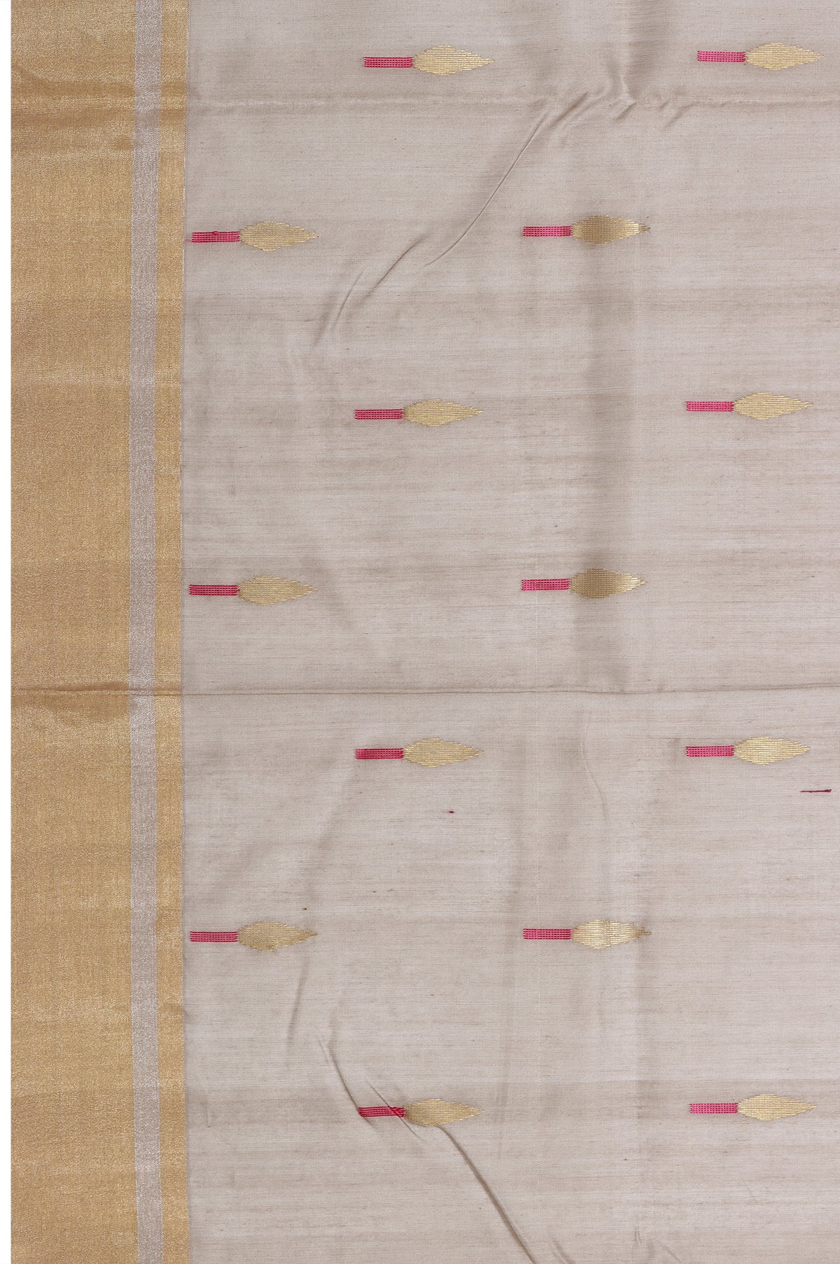 Elegant and understated, this Ash Chanderi Silk Cotton Saree features delicate leaf designs woven in shimmering gold zari and soft pink thread across its airy, graceful body. The self-coloured border is highlighted with gold and silver zari kaddi detailing for a refined touch. Its grey pallu is adorned with classic gold zari stripes and playful tassels. Paired with a plain blouse and matching border, perfect for serene, festive occasions.