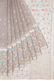 Step into refined grace with our Ash Grey Organza Silk Saree. The soothing sandal hue is accentuated by a self-colored border featuring intricate silver zari, kaddi border, floral jaal, and temple design. The matching pallu exudes sophistication with silver zari, creating a seamless ensemble that perfectly complements the self-patterned blouse with a border and delicate silver zari flower butta on the body. This saree is an epitome of timeless charm for any special occasion.