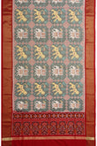 Description -Elegant and striking, this Ash Rajkot Patola Saree showcases traditional Ikat craftsmanship with bold Yanai (elephant) and lion motifs across its body. The rich Maroon border features a classic gold zari twill weave, adding timeless charm. Its Maroon pallu beautifully complements the look with intricate Ikat designs. Paired with a plain Maroon blouse, perfect for festive gatherings and cultural occasions.