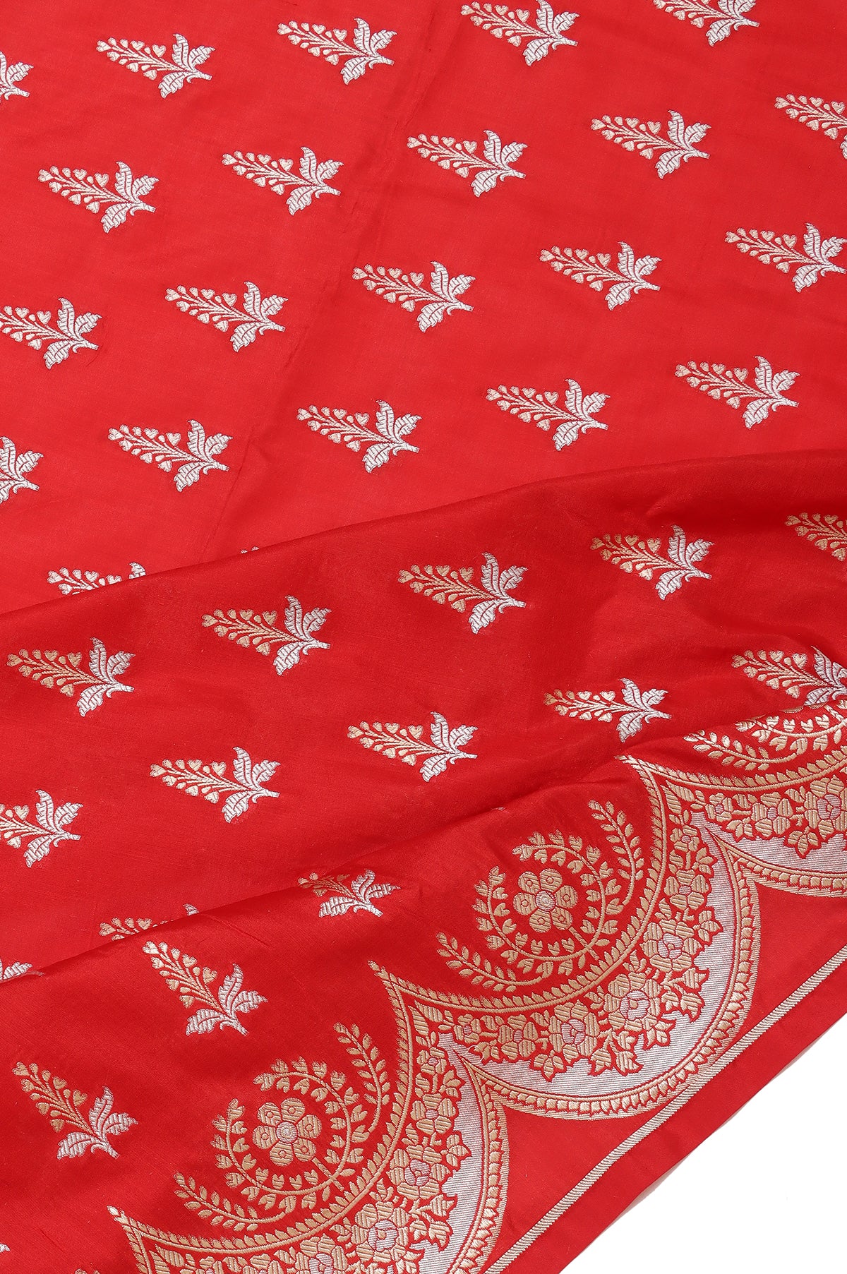 A regal Red Banaras Katan saree, adorned with exquisite Gold and Silver Zari work. The body features graceful tree motifs woven in dual-toned zari, exuding timeless charm. Its self-coloured scallop border in Gold and Silver Zari adds a delicate finish. The pallu showcases intricate floral designs, diamond buttas, and leaf patterns in shimmering zari. Paired with a plain self blouse with matching border, this saree is a classic choice for festive and wedding occasions.