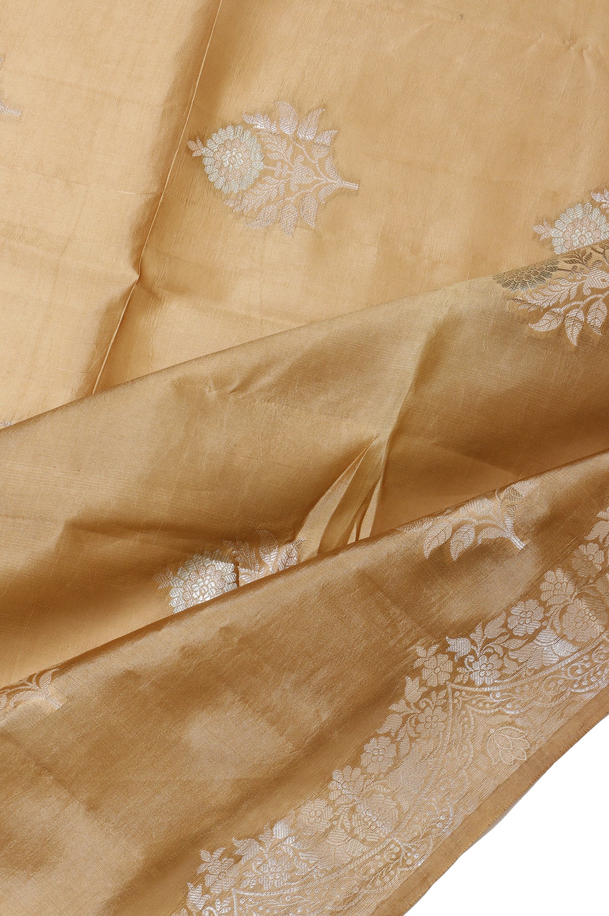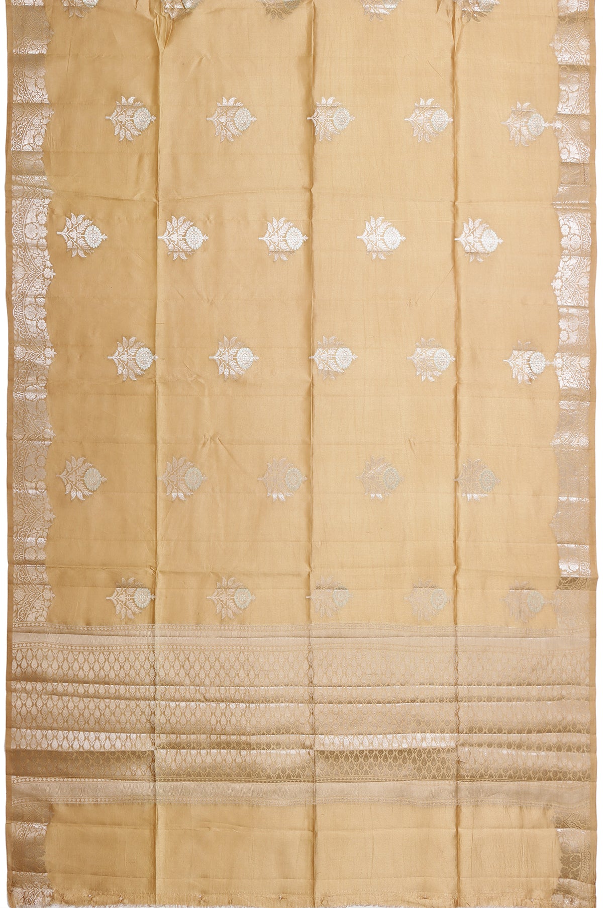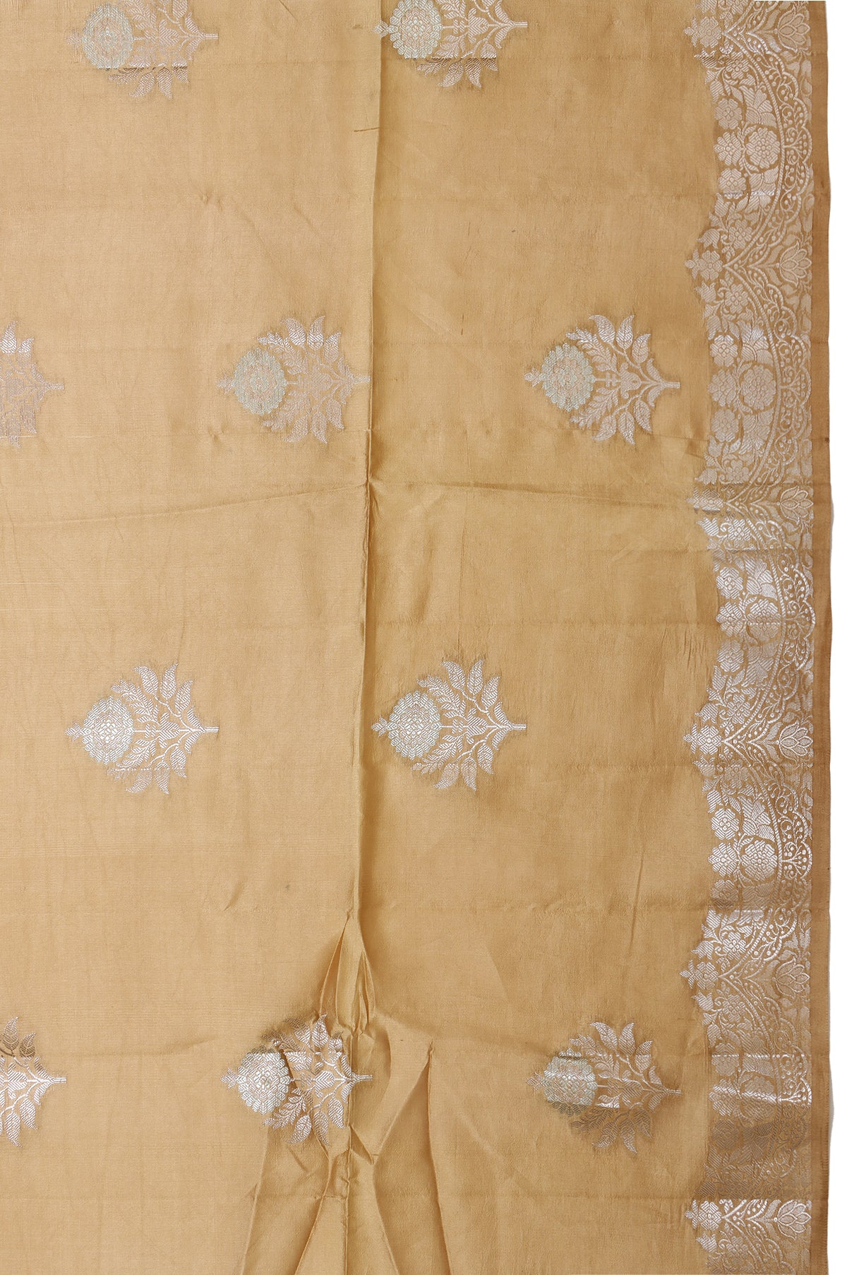 Elegant and timeless, this Beige Chiniya Silk Saree features exquisite gold and silver zari work with graceful tree motifs across the body. The self gold zari border adorned with floral and creeper patterns adds a rich traditional charm. Its pallu showcases intricate diamond stripes with a leaf jaal design. Paired with a self plain blouse with border, perfect for festive and special occasions.