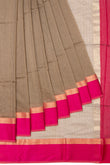 This beige-colored Maheswari Silk Cotton Saree is a classic and elegant choice. The neutral beige colour provides a subtle and versatile base that complements all skin tones and is suitable for various occasions. The pink border adds a perfect contrast, enhancing the saree's beauty. This combination is often favoured for its timeless and sophisticated appeal. Whether worn casually or at formal events, you are sure to make a graceful and memorable statement. The body is plain but it is balanced with a compelling pink border set in twill design and chevron pattern.