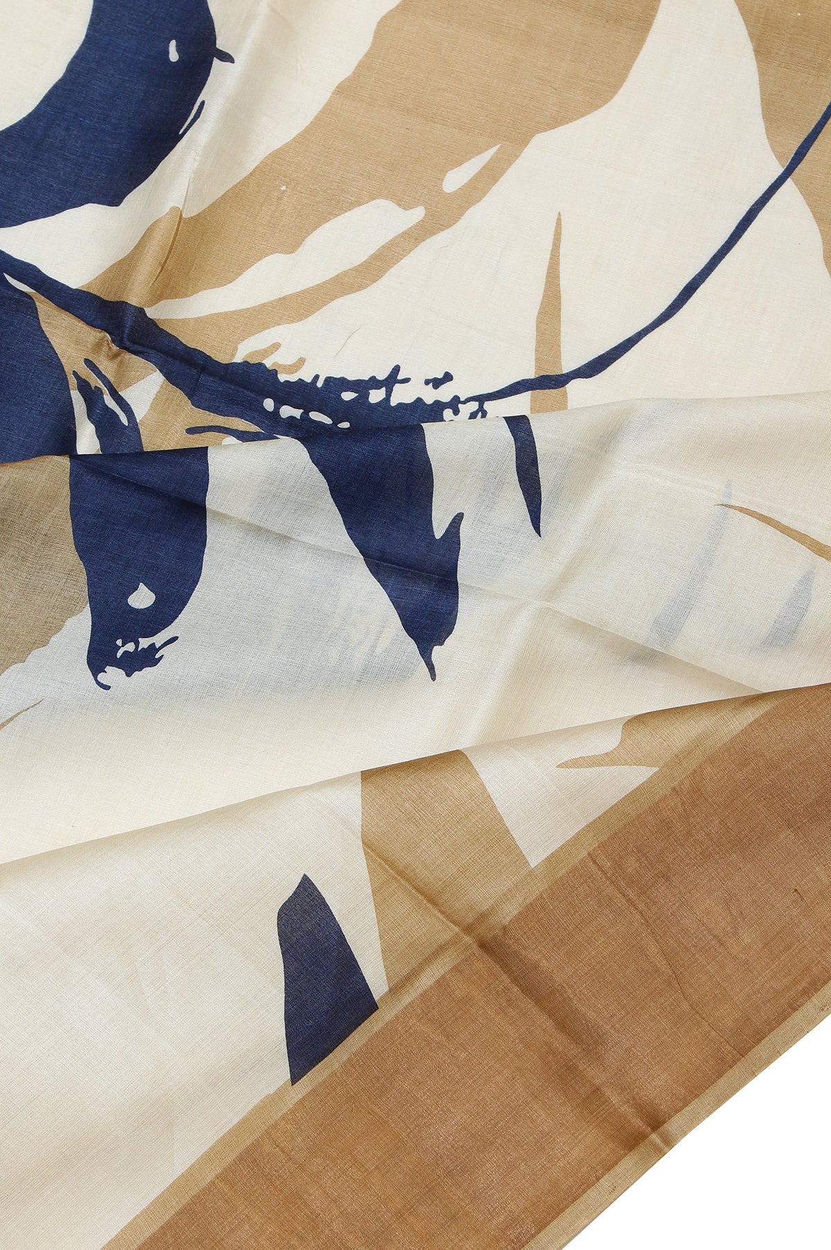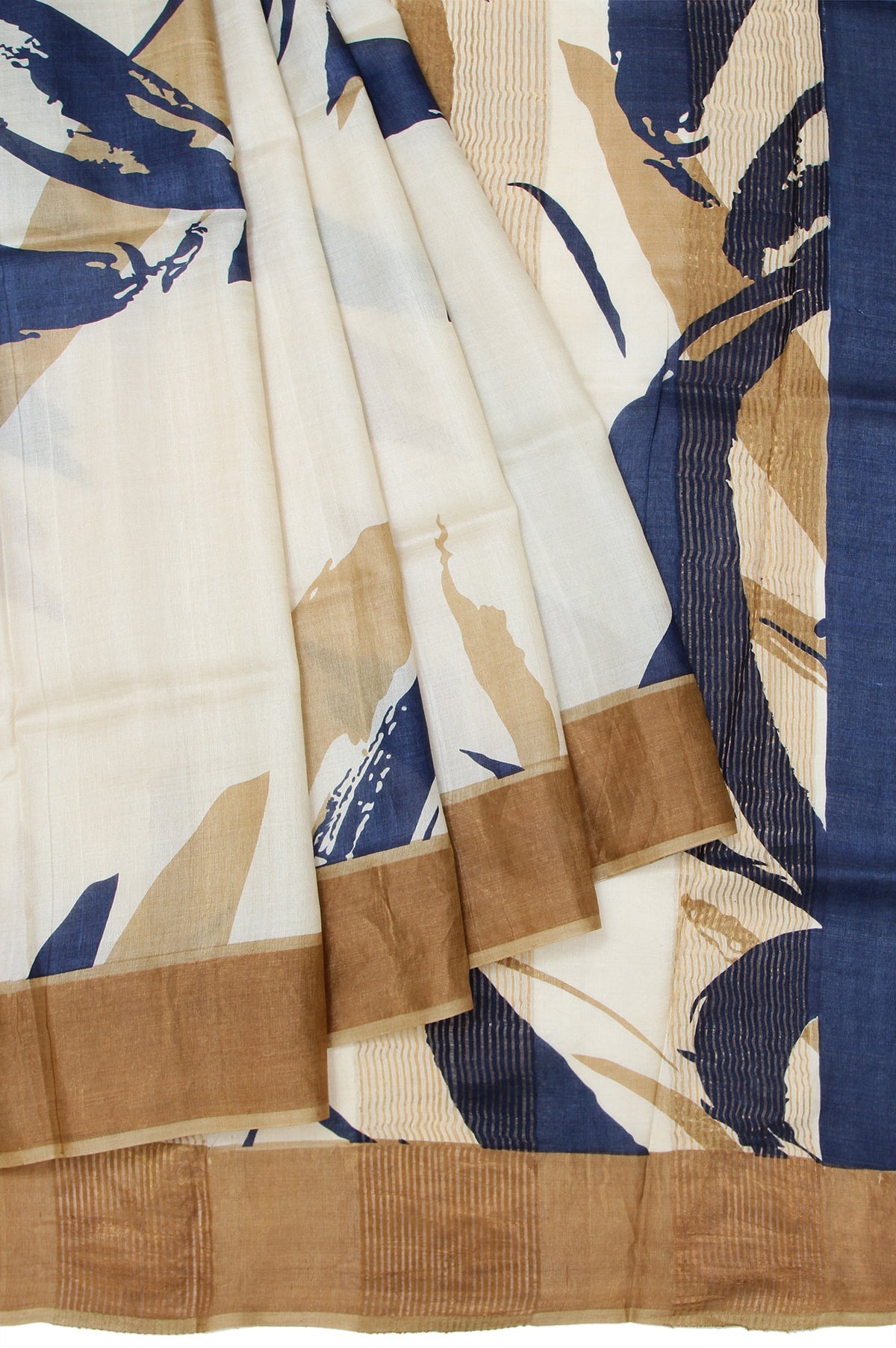 This elegant Beige Tussar Silk Saree comes with a mehandhi green gold zari kaddi border that enhances its timeless beauty. The body features an all-over design, while the self pallu showcases gold zari stripes. Paired with a plain brown blouse with a border, this saree is a graceful choice for any occasion.