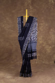 Description: Elevate your style with this gorgeous Ink Blue Chanderi Silk Cotton Saree! The gold zari kaddi border and printed motifs body design add a touch of glamour to this classic piece. The raw silk pallu and self-colored blouse with printed border are the perfect complements.