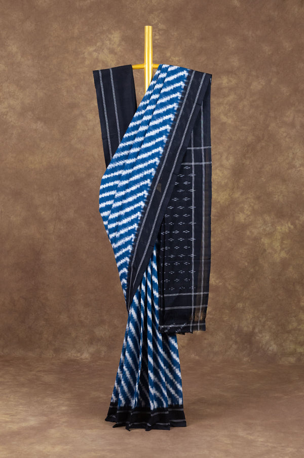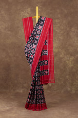 The combination of red and black has been accepted and acclaimed again and again. So it is no wonder this Ikat Cotton Saree stands out in distinction. Certainly this is the saree every ideal wardrobe must have. Gorgeous checks and rangoli design delightfully fills the body that extends up to the red border with white stripes. The pallu reflects white stripes and rangoli design.