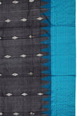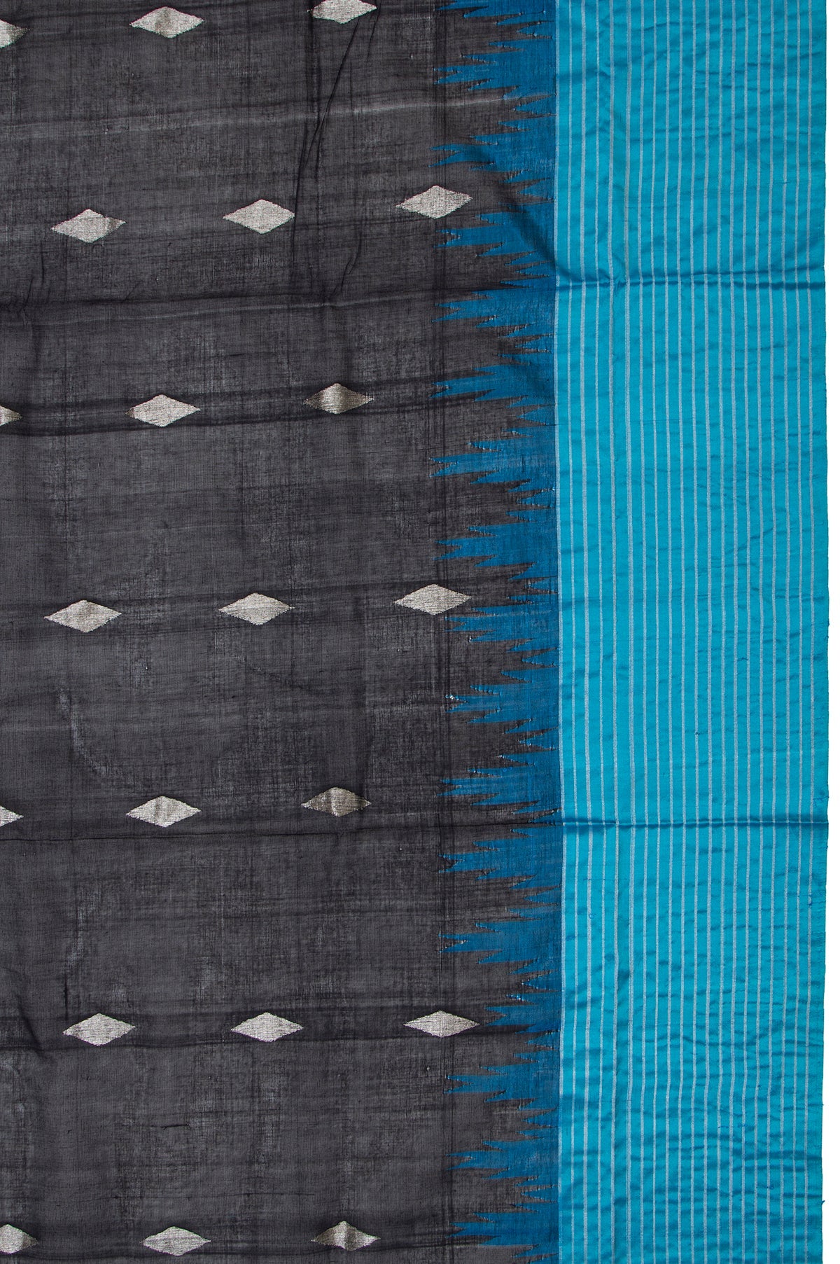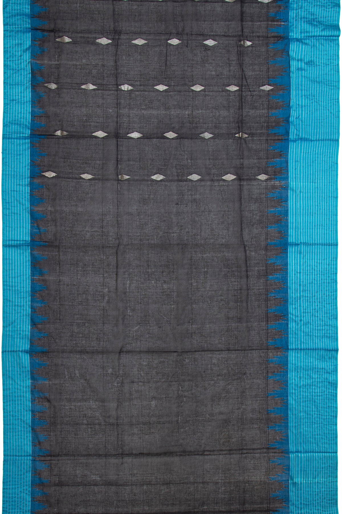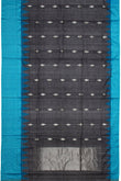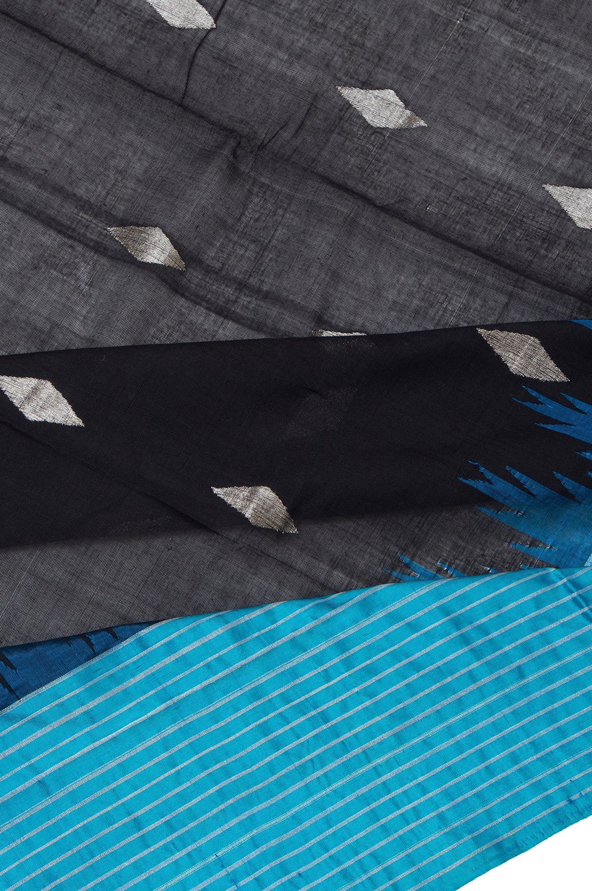 The Black Pondhuru Cotton Saree in black is a true classic with its sea blue border, silver zari stripes, and thazhampooreku pallu. The body design features exquisite silver zari and diamond butta motifs.