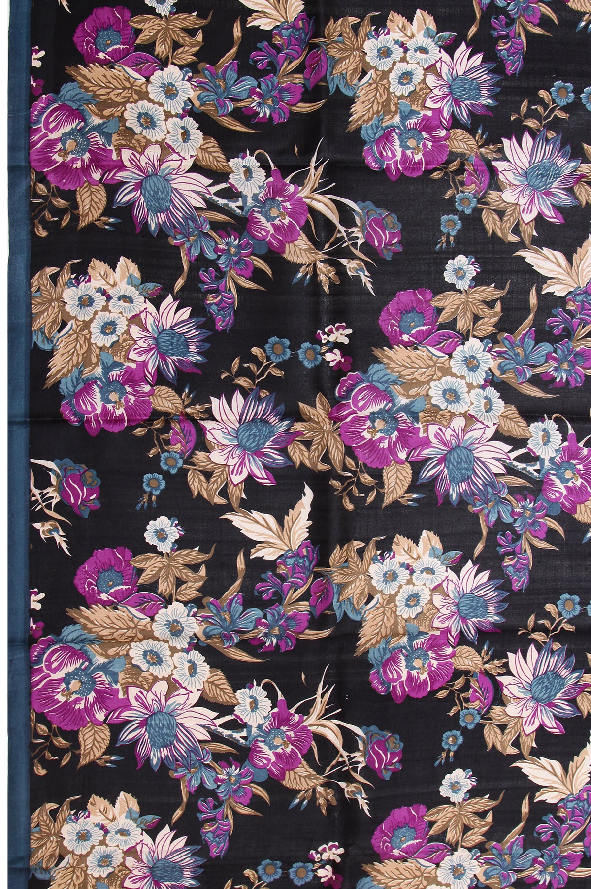 Black Pure Silk Saree with Peacock Blue Border and Printed Flower Motifs
