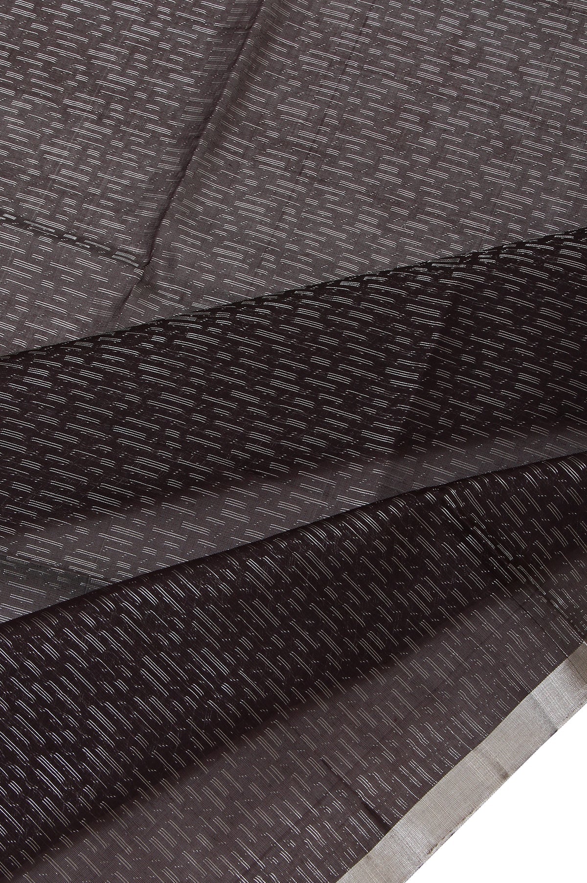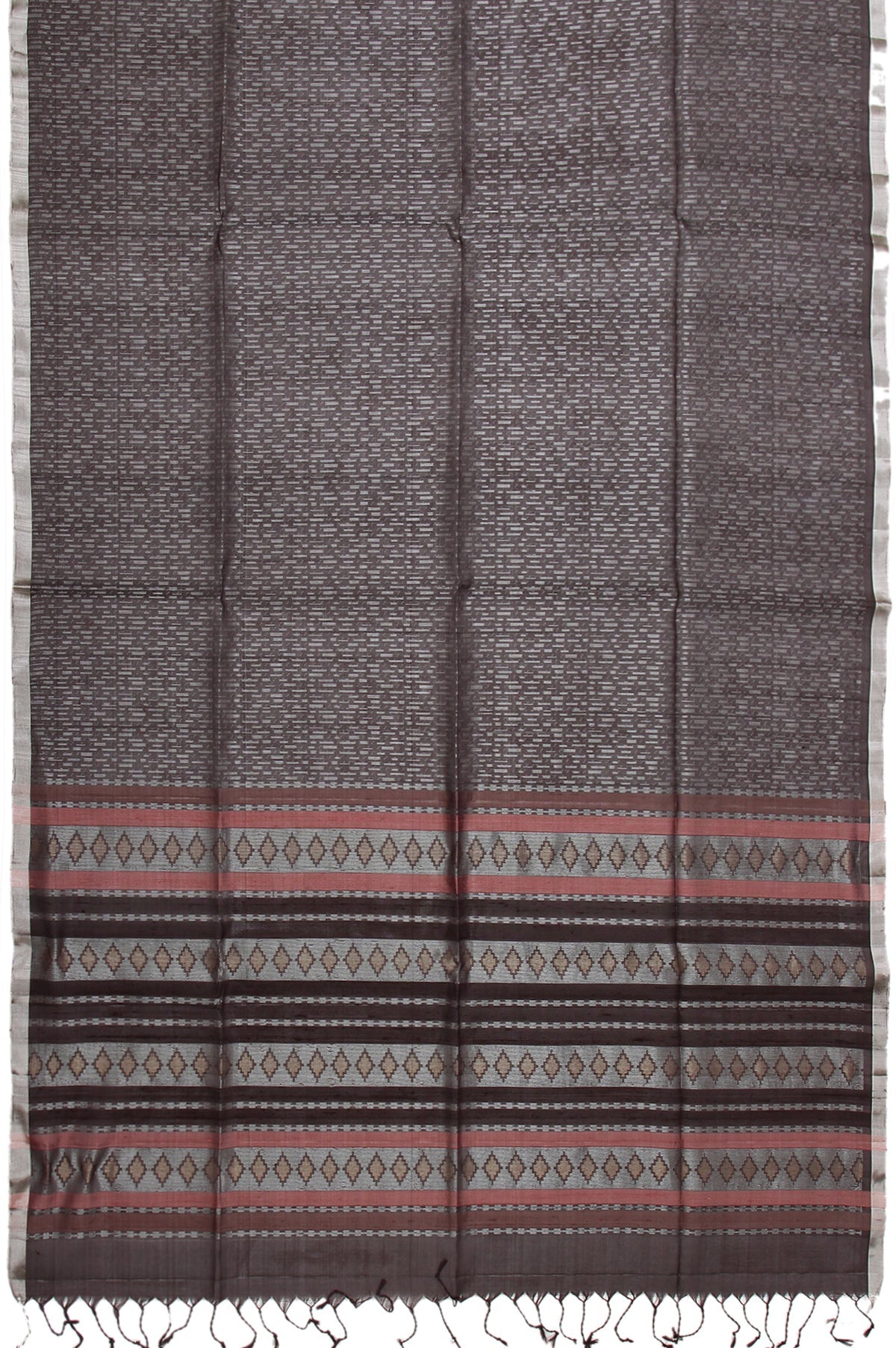 Command attention with the Black Kanchi Kora Silk Saree. Featuring a self border with silver zari and a multi-color striped pallu, this saree embodies modern sophistication. The tassels and diamond butta detail in silver and gold zari create a luxurious finish. The light brown blouse with silver zari detailing adds depth to the body’s striped butta pattern, making this saree a stunning choice for any occasion.