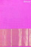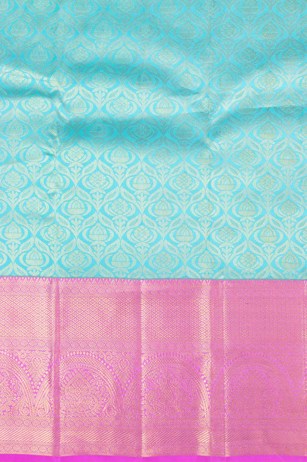 Shine in this blue and pink saree with a self-colored kaddi border embellished with gold zari. The pink pallu features leaf design, all-over butta, flower design, and multi-design lines, while the plain pink blouse adds a touch of elegance with a border.