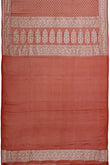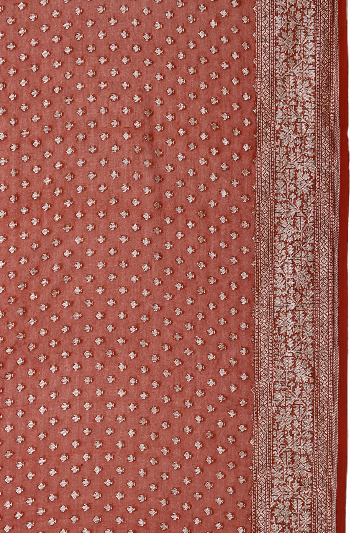 Elegant and understated, this Brown Banaras Georgette Saree is adorned with delicate silver zari flower buttas that lend a graceful shimmer. The self-coloured border features intricate floral creepers in silver zari, adding a touch of classic charm. Its pallu continues the theme with elegant floral creepers and tree motifs. Paired with a plain self blouse with border, it’s perfect for refined festive and evening occasions.