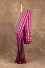 This Gadwal Silk Cotton Saree comes with an attention-grabbing colour combination, sporting brown body and pink border. While stripes enhance the beauty of the body, gold zari, flower and diamond butta embellish the border. The pallu is an added attraction as it brilliantly shows off gold zari and attractive stripes,