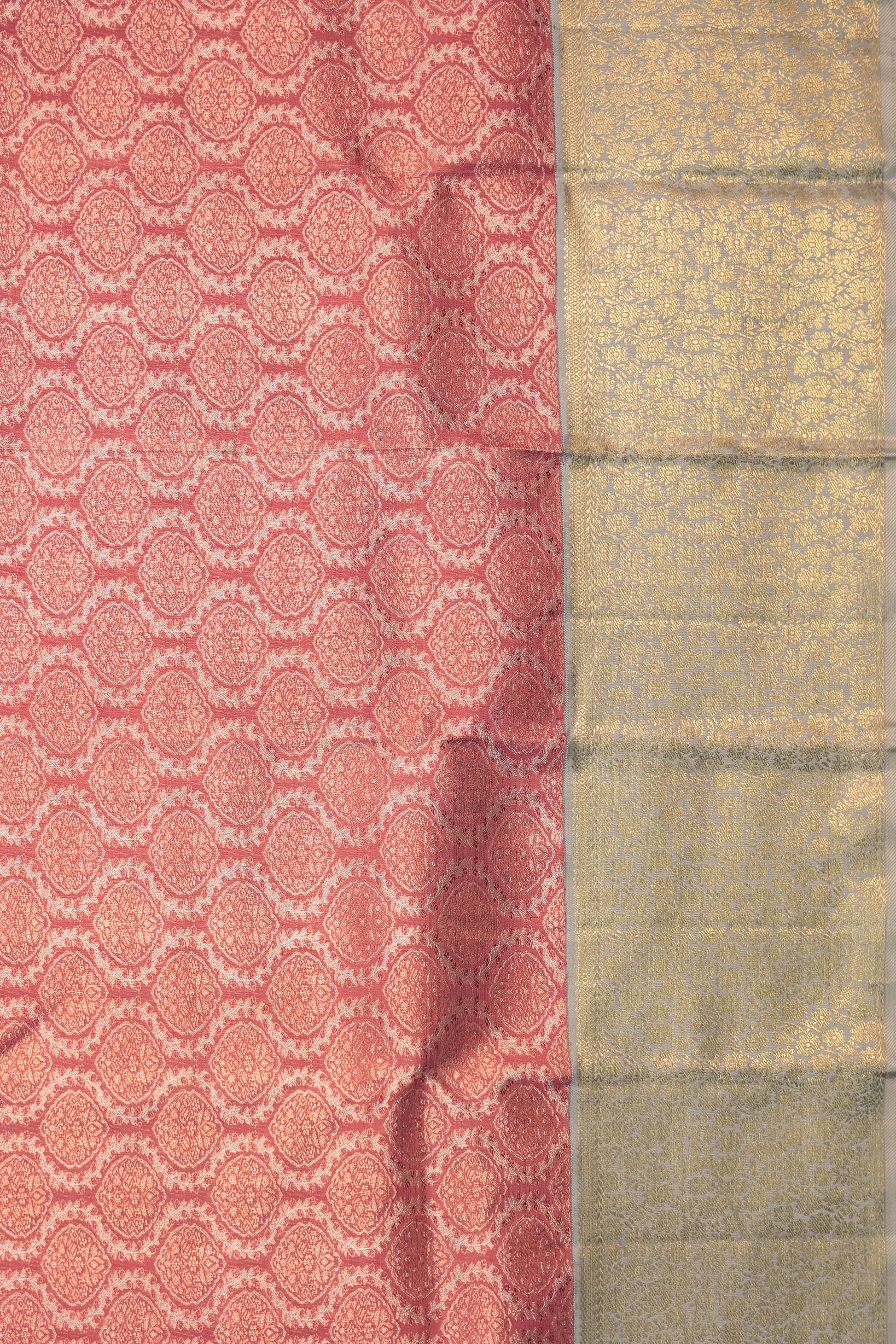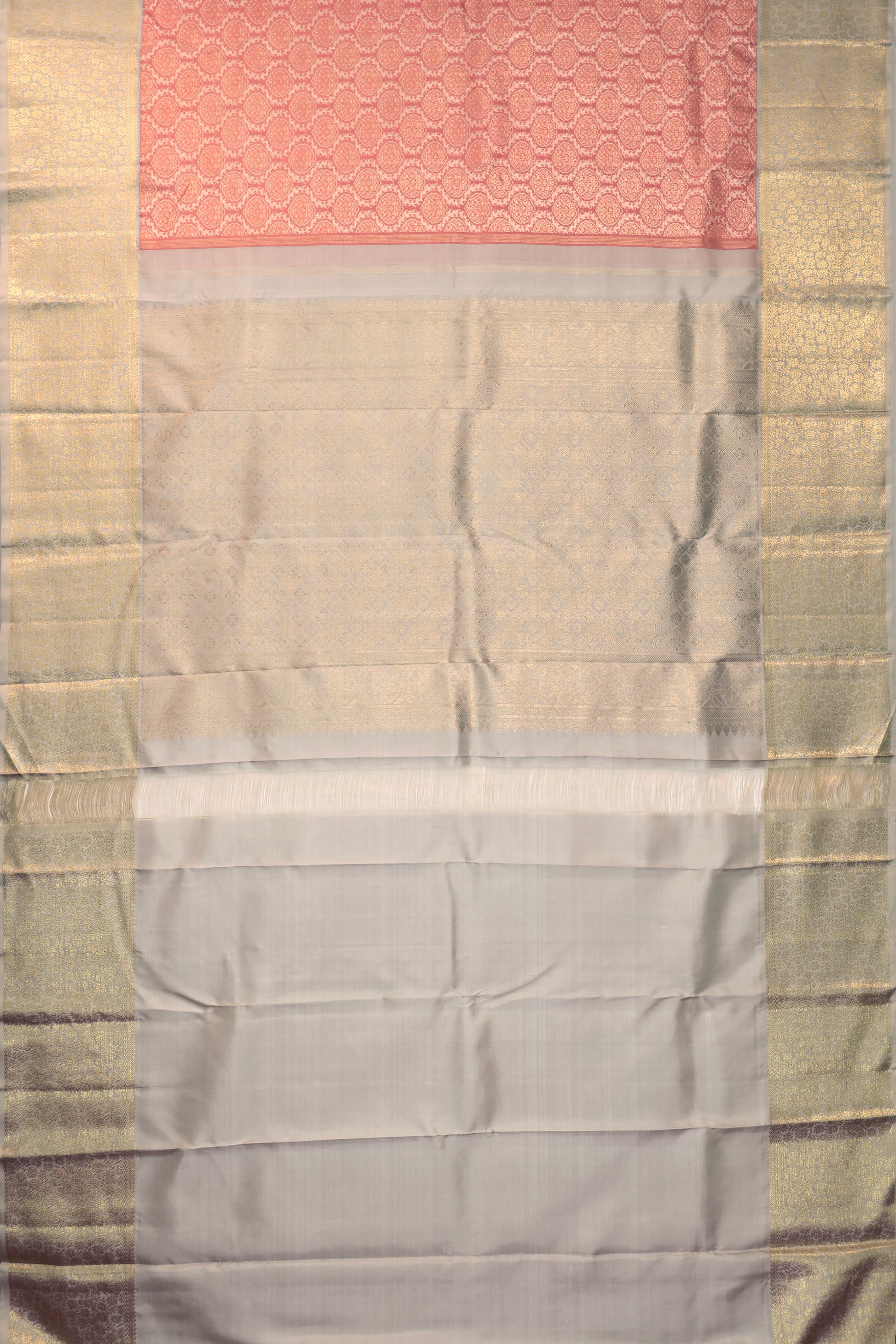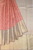 Enhance your traditional collection with this Brown Kanchipuram silk saree, featuring silver and copper zari floral jaal on the body. The beige border is adorned with gold zari floral jaal, while the pallu showcases checks with flower motifs. Comes with a matching beige blouse, perfect for weddings, festive occasions, and cultural celebrations.
