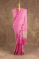 Description: This Chanderi Silk Cotton Saree is a beautiful piece with a soft and lightweight texture, making it a comfortable choice for formal occasions. The saree has a charming pink border, adding a subtle pop of colour to the piece. The saree's pallu features a stunning combination of pink and gold zari stripes, giving it an elegant and traditional look. The pallu also includes thread butta with tassels that add a touch of sophistication to the saree.