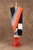 This Ikat Cotton Saree serves twin-purpose. While it is a perfect party wear, it can also be comfortable work wear. It is for you to decide whom to impress- your colleagues or your co-revellers. The body is conceptualised in Chevron pattern, and is decked with Ikat butta. The Ganga Jamuna border too is set in Chevron pattern while the black and white pallu comes with engaging stripes.