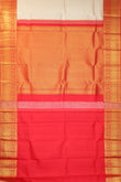 This stunning cream Kanchipuram Silk Saree exudes timeless elegance with its rich gold and silver zari floral jaal design, featuring intricate Kili (parrot) motifs on the body. The bold red border is adorned with gold zari twill and floral jaal patterns, along with diamond buttas, adding a regal touch. The pallu, in matching red, features checks with diamond buttas and Rudraksha buttas in gold zari. Paired with a plain red blouse with a matching border, this saree is perfect for weddings, festive occasions, and grand celebrations.