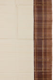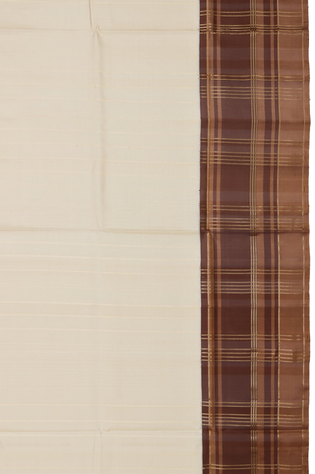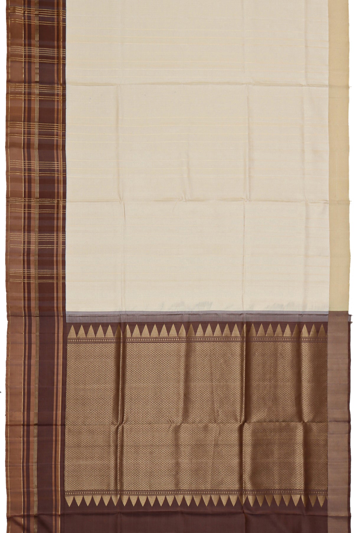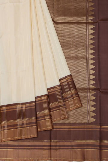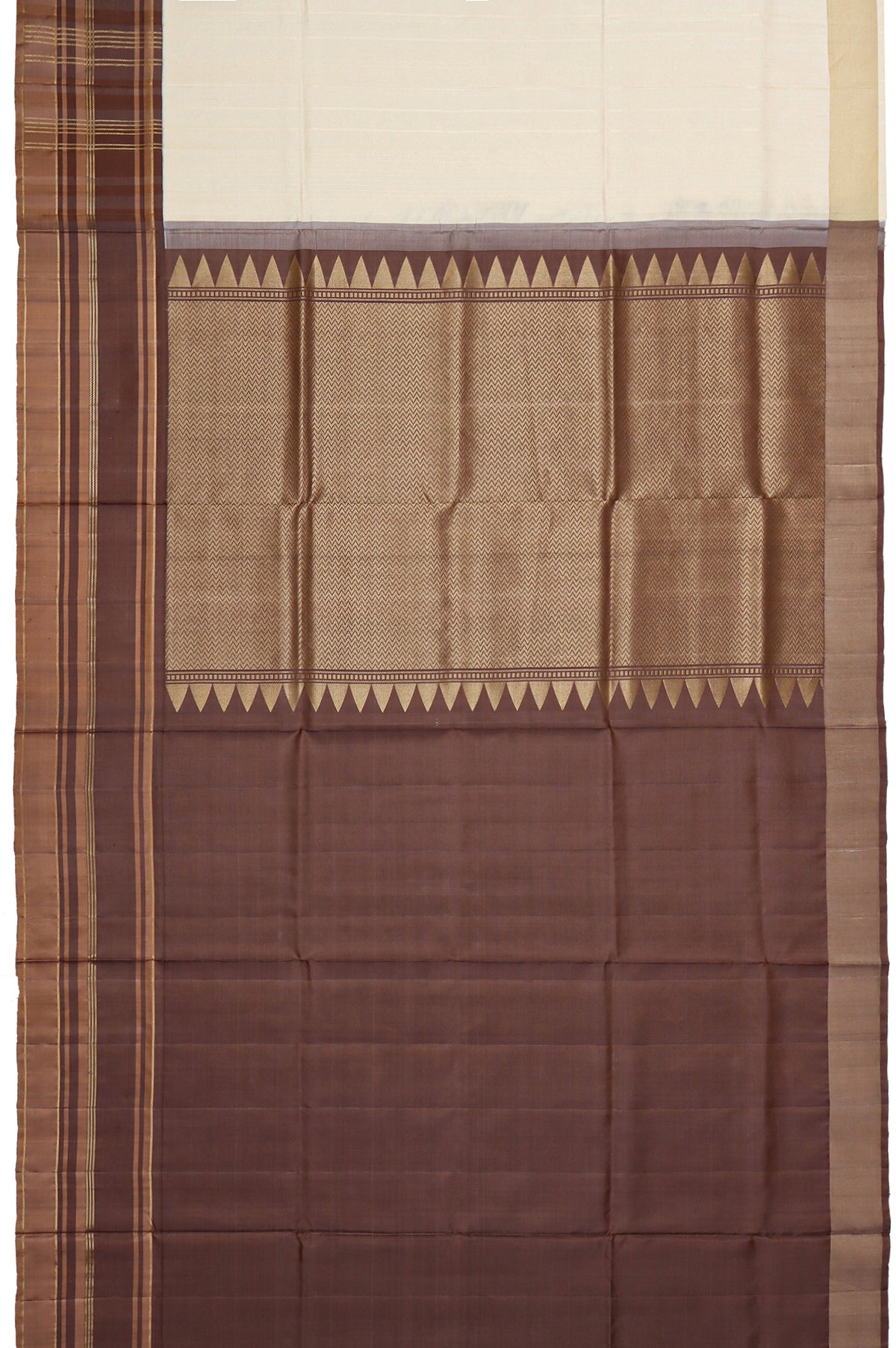 This Cream Soft Silk Saree is a beautiful blend of elegance and vibrancy, featuring a luxurious brown border enhanced with gold zari stripes and lively multi-color stripes. The pallu enchants with its rich brown tone, showcasing intricate temple motifs, a stylish chevron pattern, and charming square butta designs. The body boasts bold stripes, adding depth and visual interest to the ensemble. Complemented by a plain brown blouse, this saree is perfect for festive celebrations, making a statement that effortlessly balances tradition and contemporary style.