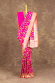 Stunningly elegant, this orange and pink Banaras katan saree has been crafted with utmost care. The Meenakari Butta dazzles in elegance, which adds to the beauty of this attire. Ultra-fine woven, this Banaras katan saree comes with beautiful floral and animal motifs, giving you a regal look.
