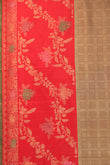 Shine in this Gold Chequered Kanchipuram Silk Saree, featuring gold zari checks with chevron patterns and dot buttas on the body. The red contrast border is enriched with gold zari, meenakari work, floral creepers, flower motifs, and green selvedge, while the pallu dazzles with matching designs and tassels. Paired with a plain red blouse with border, perfect for weddings and festive occasions.