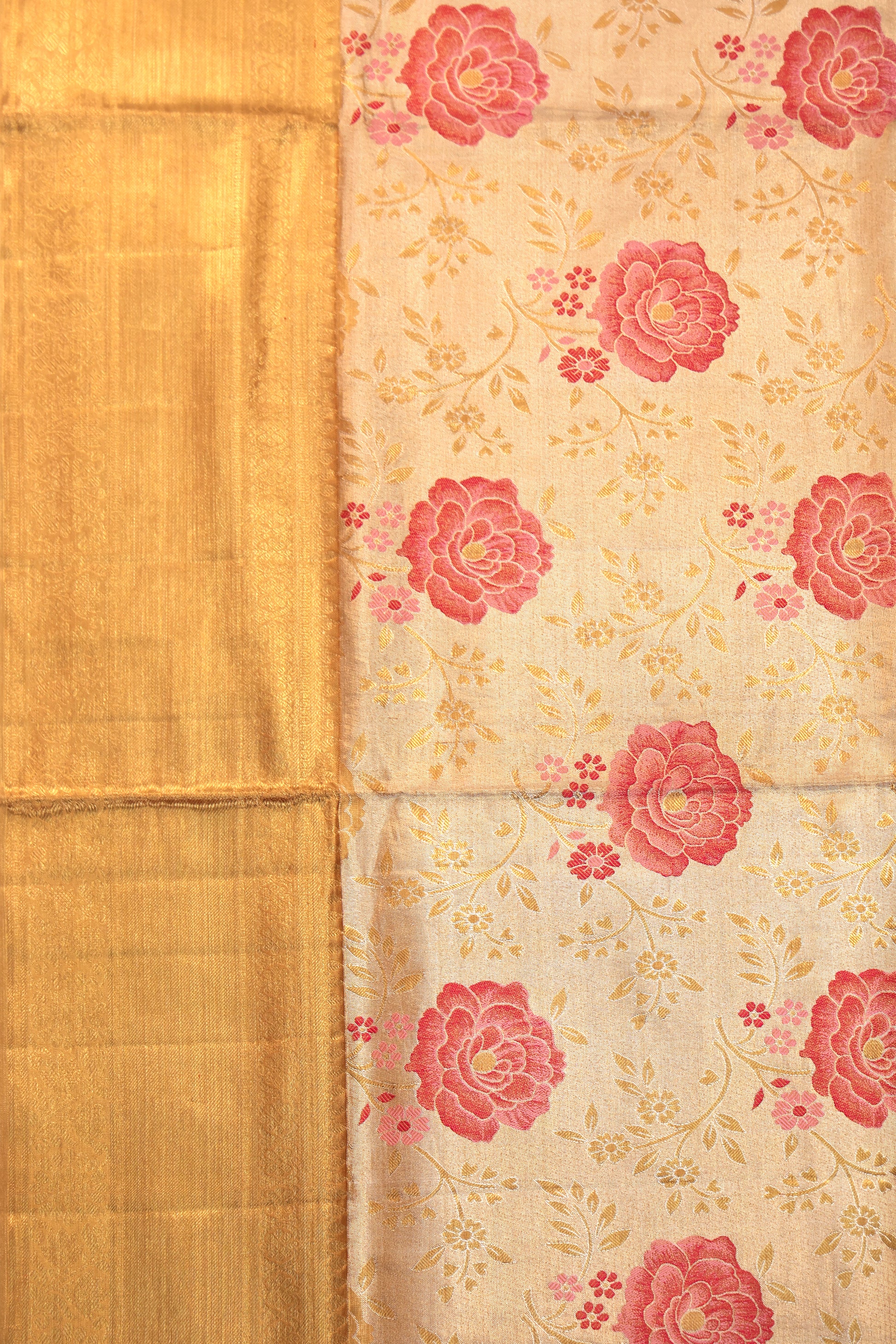 Drape yourself in regal elegance with this gold Kanchipuram silk saree featuring exquisite meenakari leaf and flower motifs. Its self gold zari kaddi border and pallu shimmer with intricate creeper designs, exuding timeless grace. Paired with a matching plain blouse with border, this saree is perfect for weddings and grand celebrations.