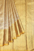 Experience understated luxury with this Self-Coloured Kanchipuram Silk Saree, beautifully woven with silver zari leaf motifs that exude grace and sophistication. The self border features gold zari diamond checks, floral creepers, and leaf buttas, creating a subtle yet regal finish. The pallu continues the elegance with rudraksha and leaf buttas set in a diamond checks pattern. Paired with a self tissue blouse accented by a matching border, this saree is the perfect choice for graceful festive and formal occasions.