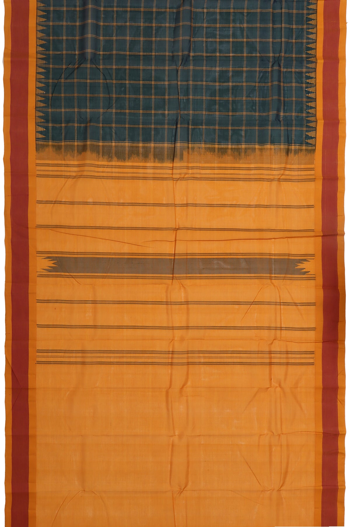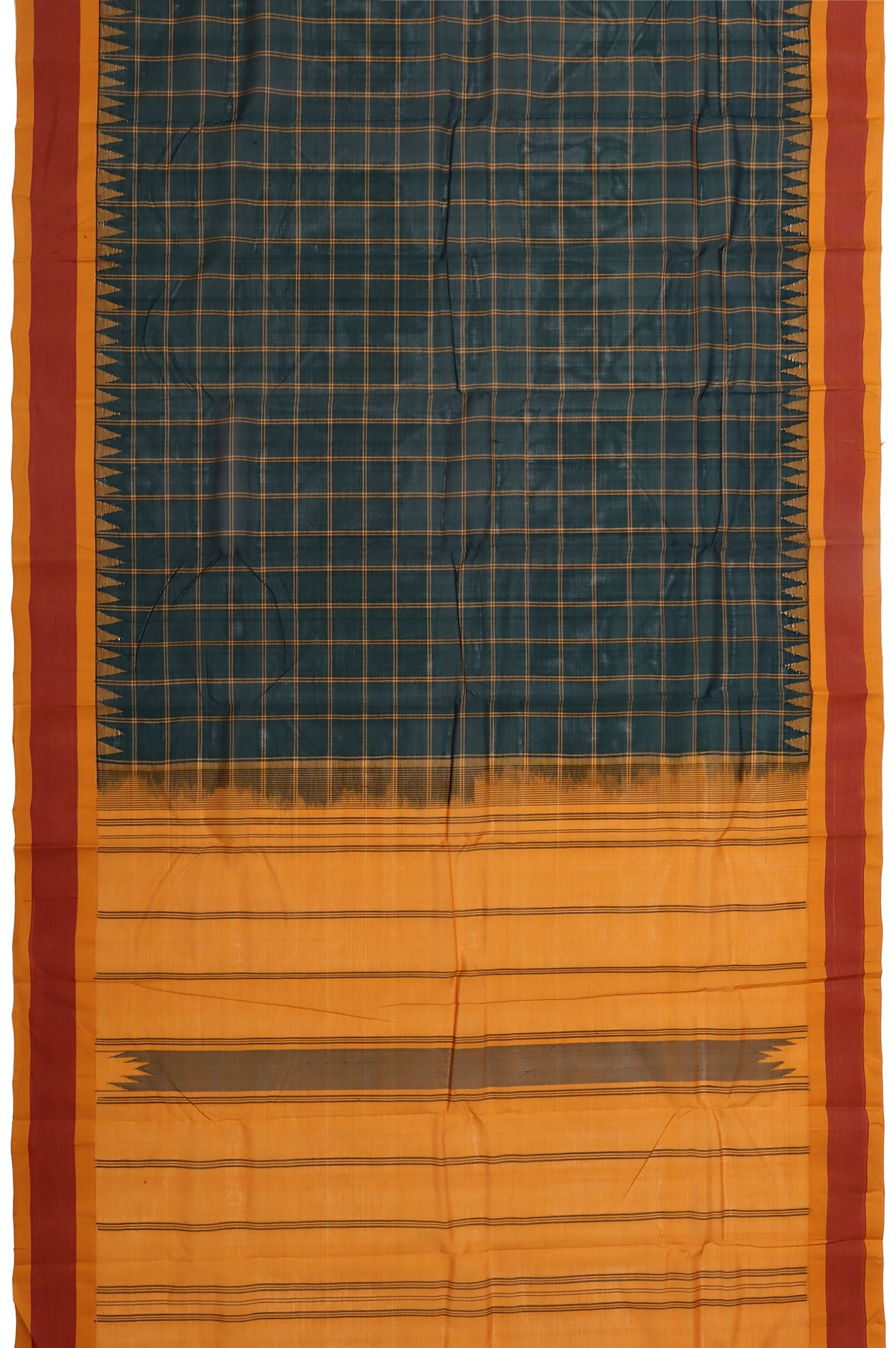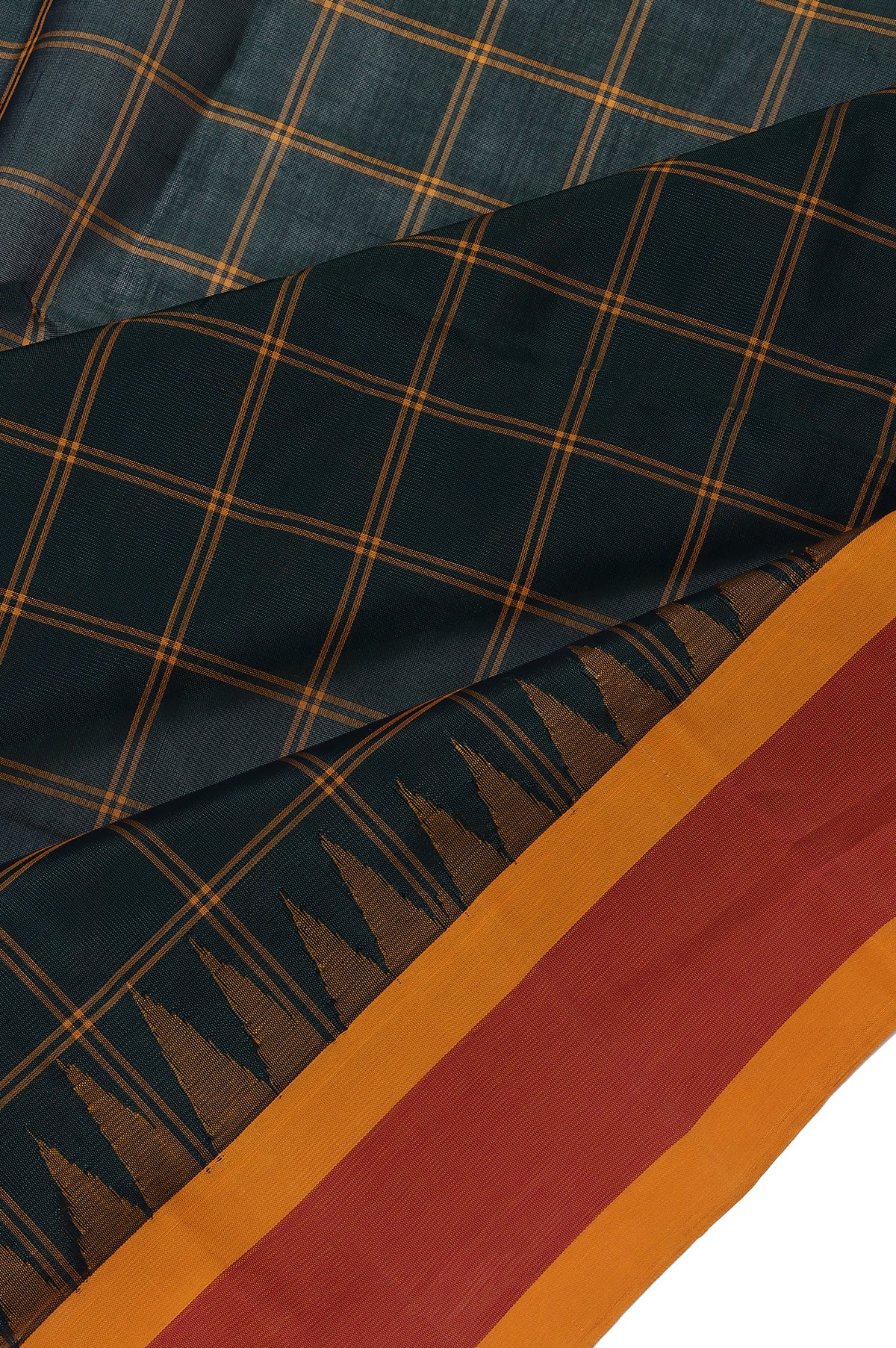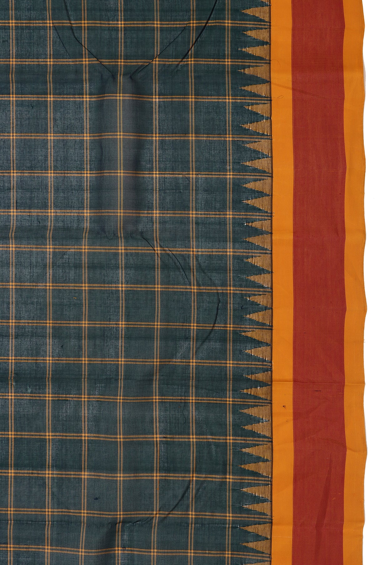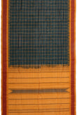 Embrace classic charm with this Green Chequered Kanchi Cotton Saree, featuring a timeless checked pattern across the body. The mustard border is plain with a traditional temple design, adding a subtle ethnic touch. Its mustard pallu showcases simple stripes for a graceful finish. Complemented by a plain mustard blouse with a matching border, this saree blends heritage aesthetics with everyday comfort—perfect for casual gatherings, traditional wear, or elegant day-to-day styling.