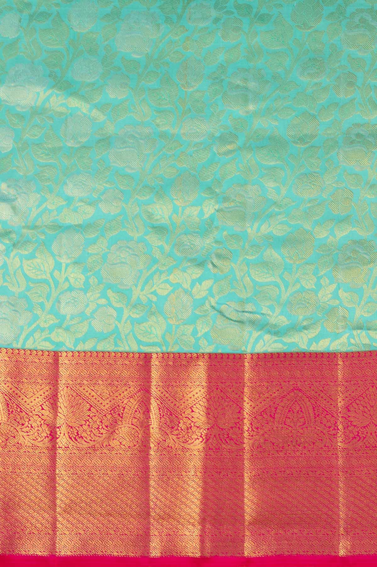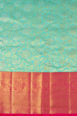 Add a touch of sophistication in this Sea green saree with gold zari floral jaal and circle with flower butta border. The red pallu features a similar design with checks and leaf butta, complemented by a plain red blouse.