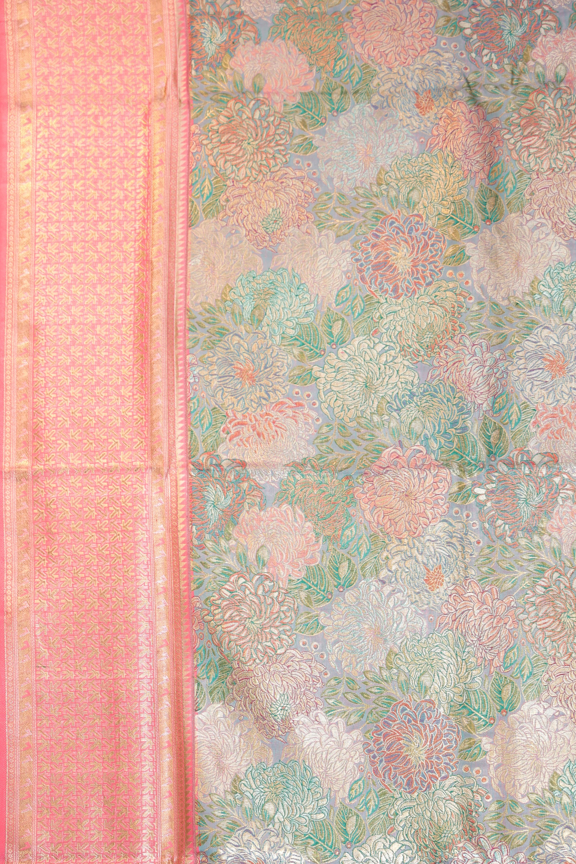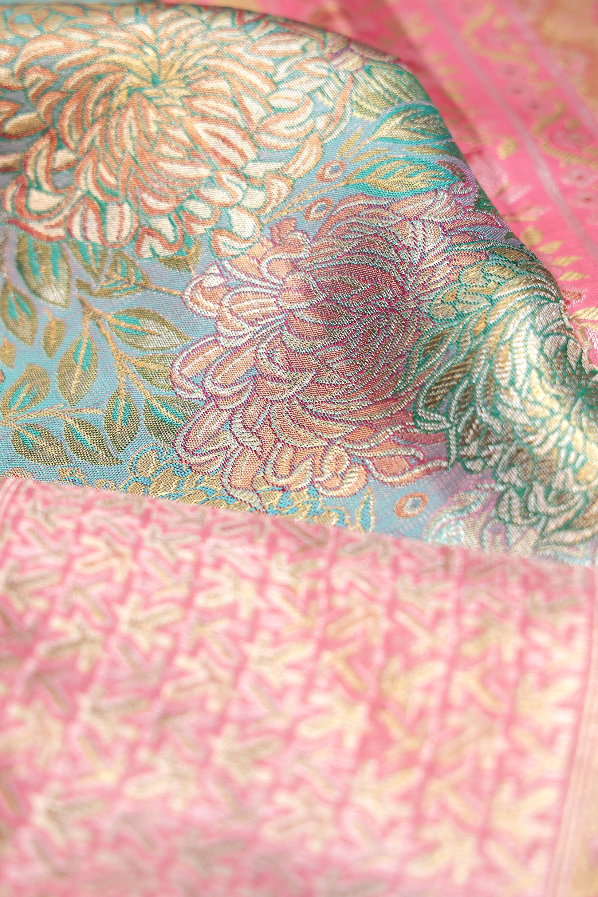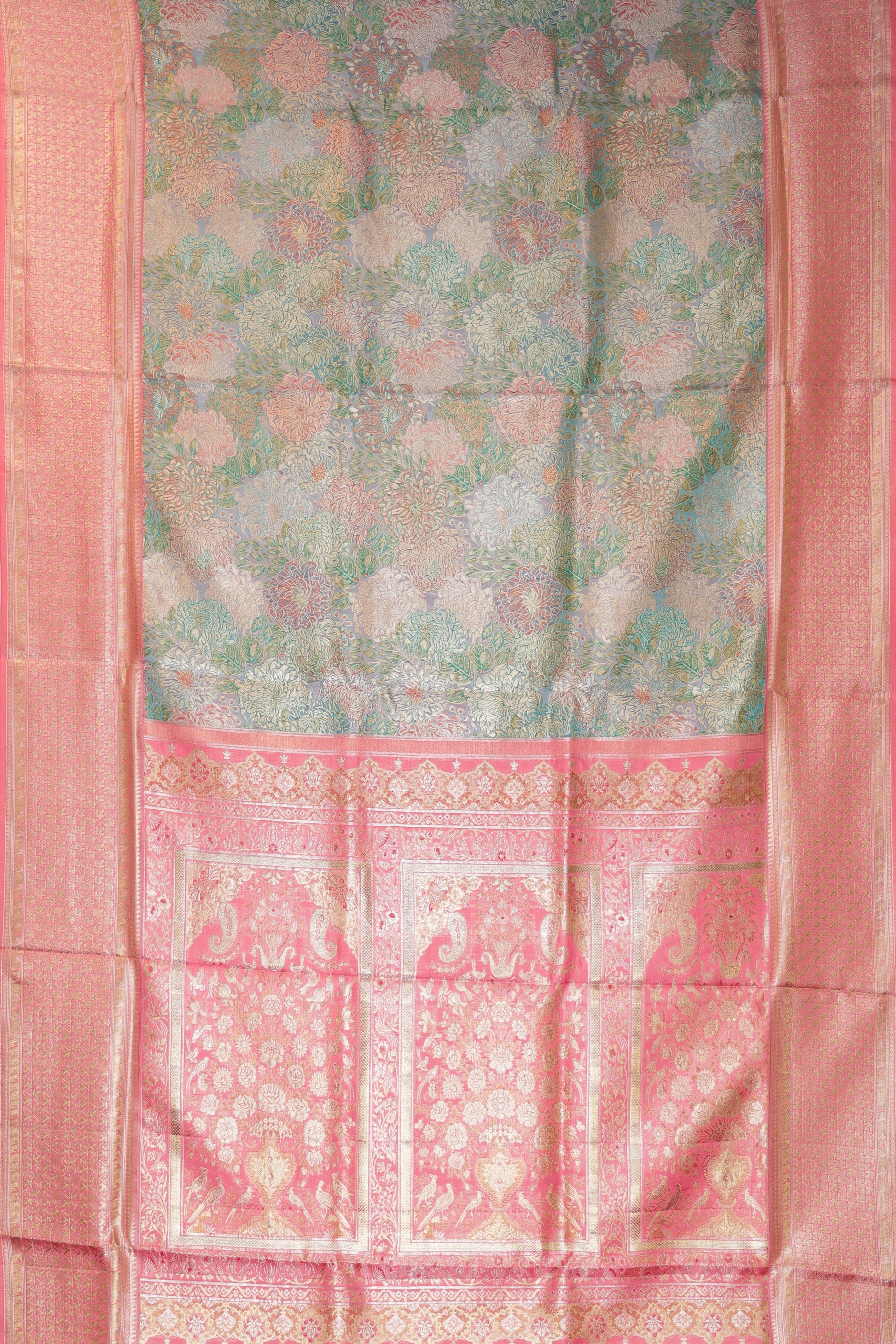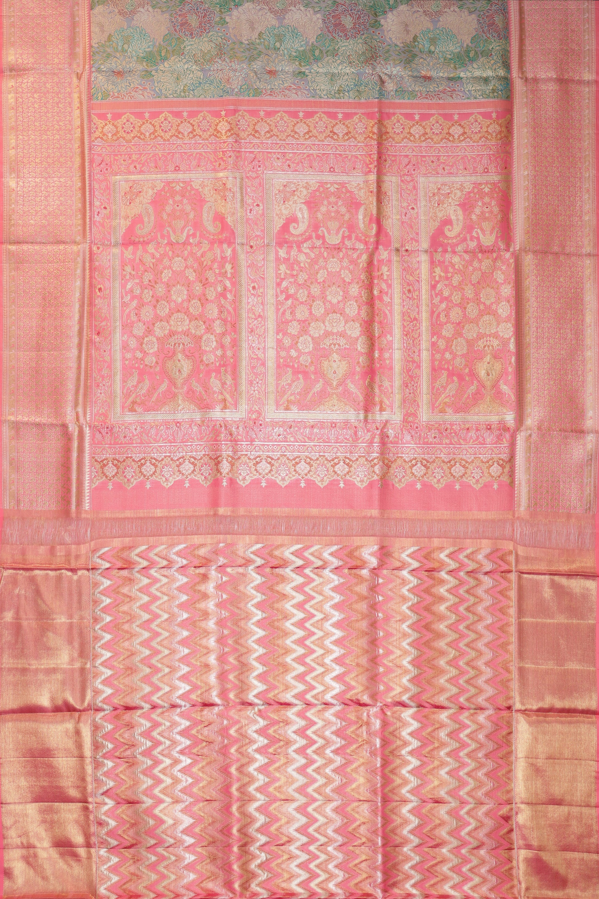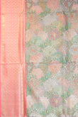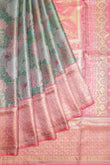Drape yourself in regal splendor with this green Kanchipuram tissue silk saree, featuring exquisite all-over Meenakari patterns and a large contrasting border. The pastel undertone adds soft elegance, while the intricate artistry showcases timeless craftsmanship. Perfect for grand weddings and celebrations, this saree embodies luxurious tradition, grace, and the opulence of pure Kanchipuram weaving.