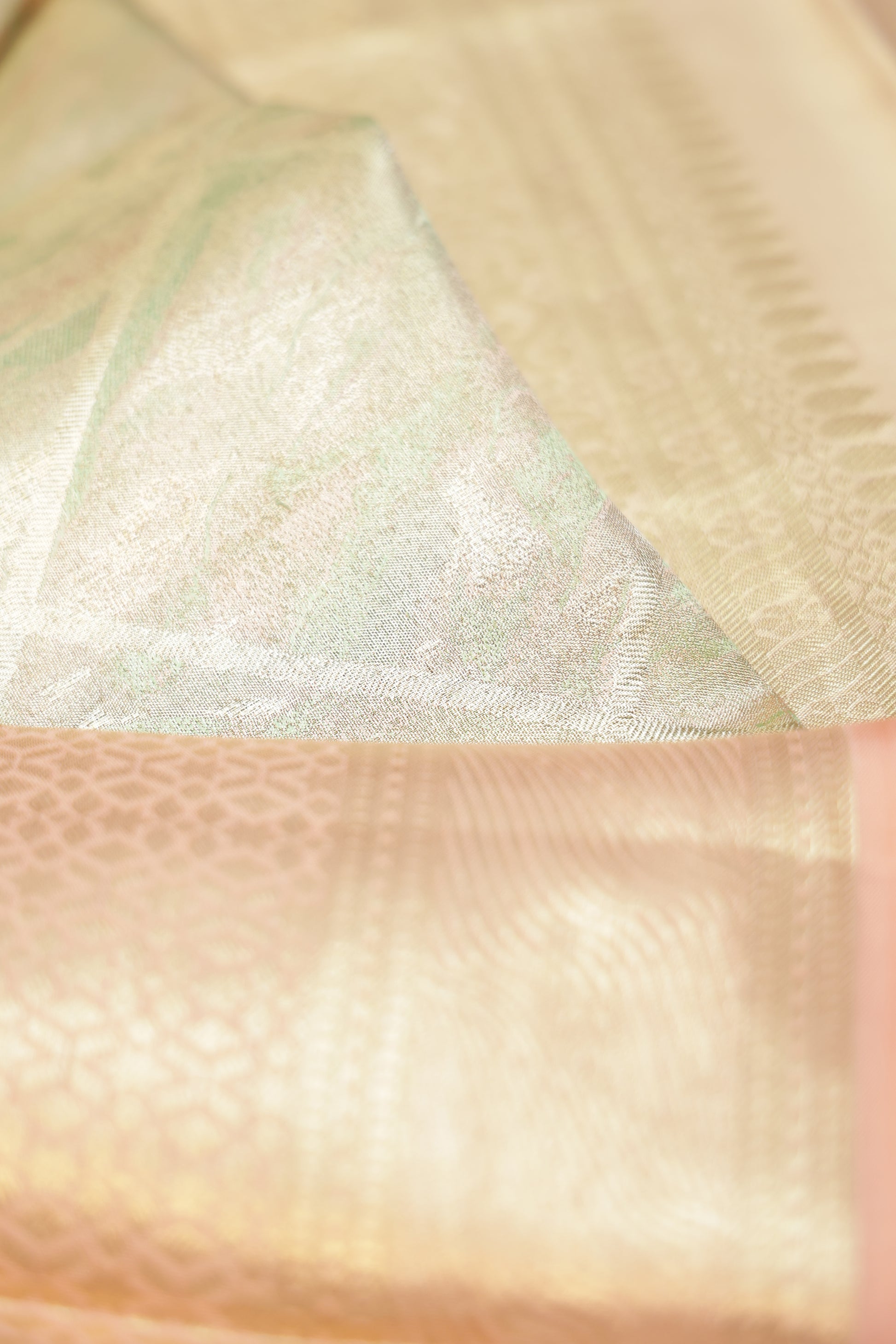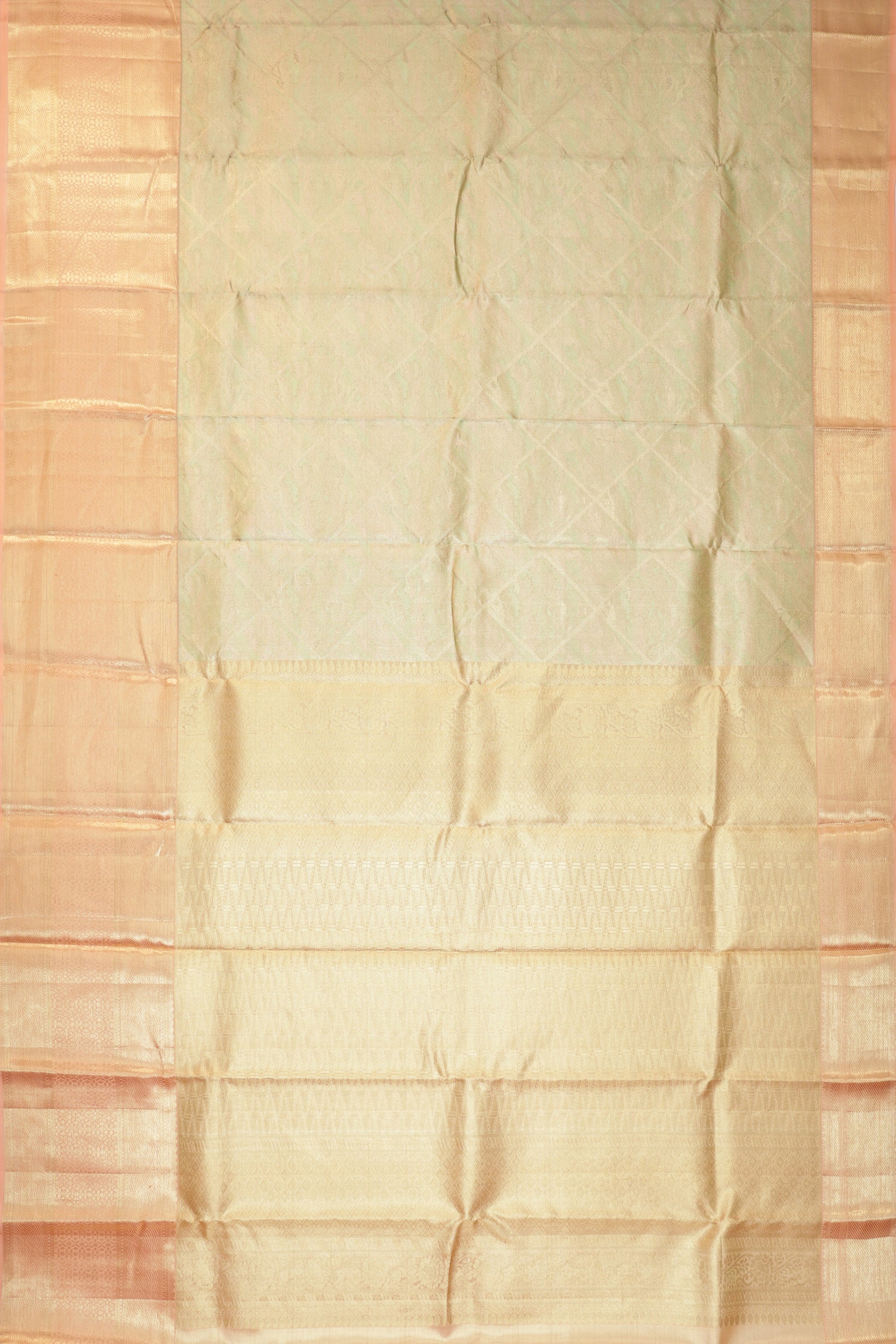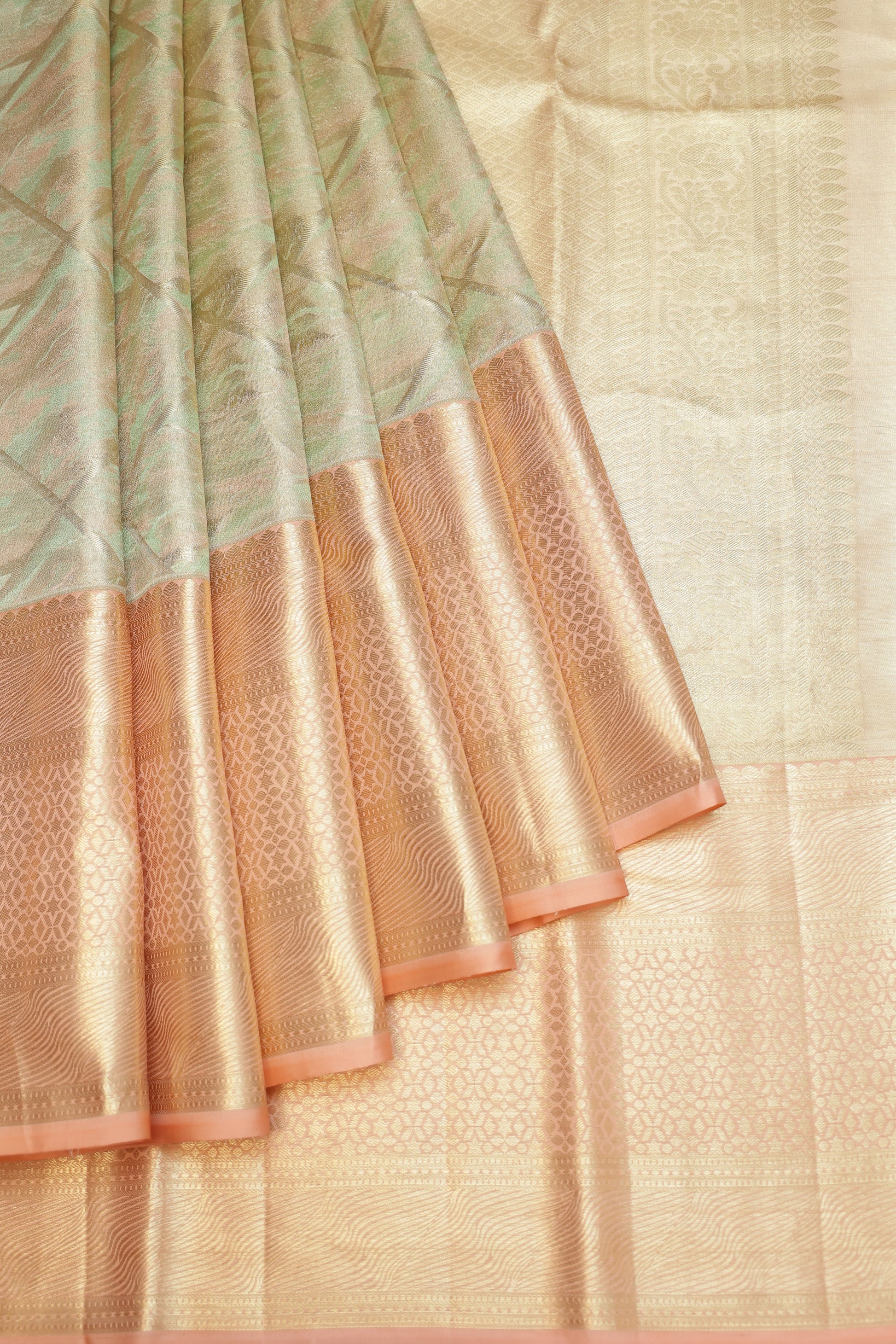 A Green Kanchipuram Tissue Silk Saree featuring gold zari checks combined with an artistic abstract design that adds a modern touch to its traditional weave. The peach border is crafted with gold zari geometric patterns and delicate leaf buttas, offering a refined contrast. Its matching peach pallu showcases gold zari checks enhanced with floral creepers, diamond details, and flower buttas. Paired with a peach tissue blouse in a plain style with a coordinated border, the saree reflects fine craftsmanship and elegant detailing.