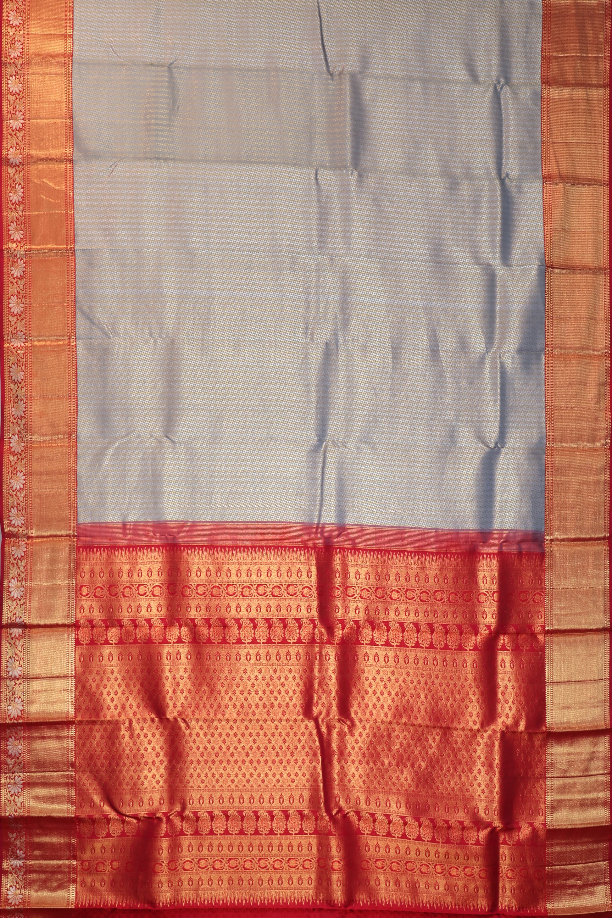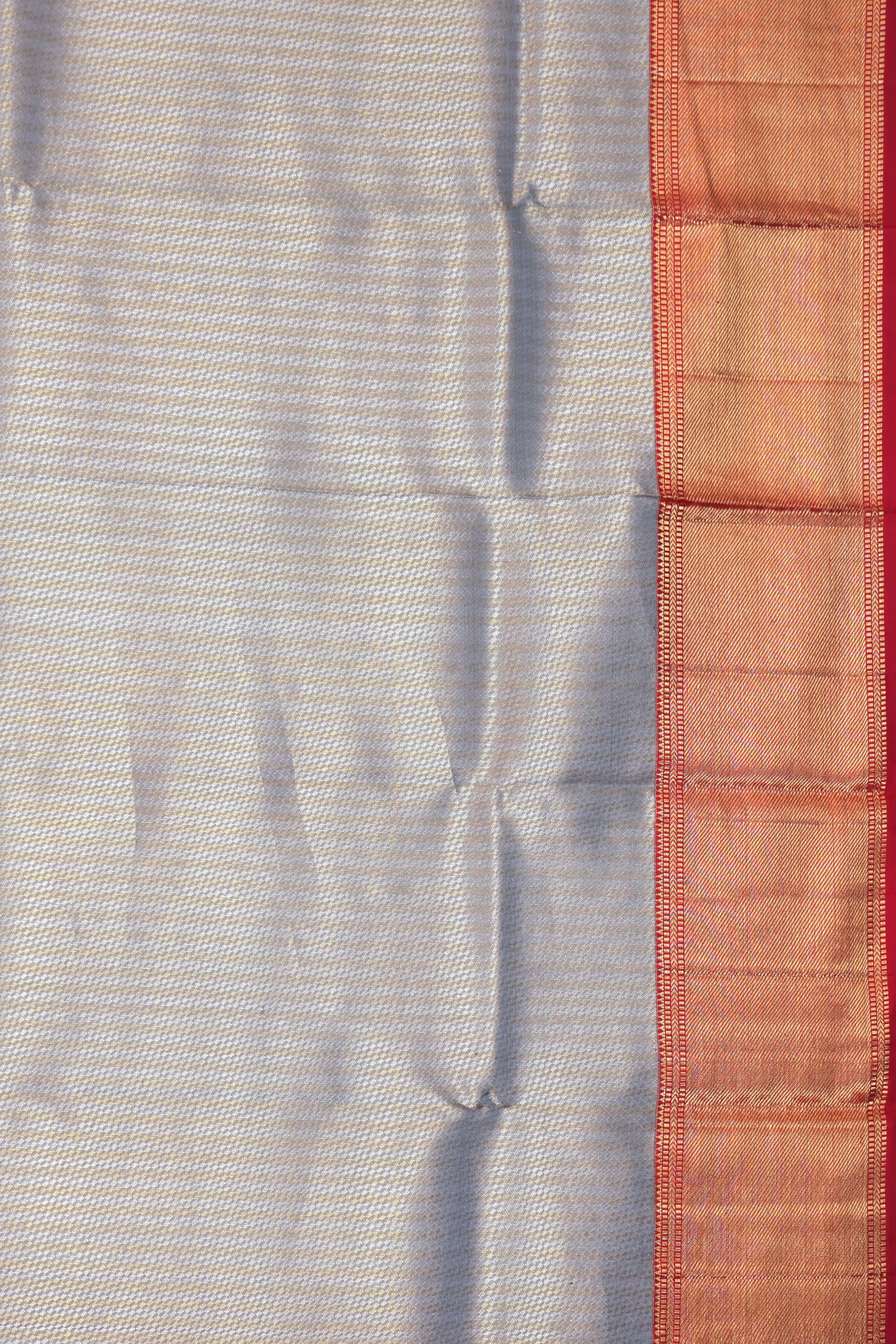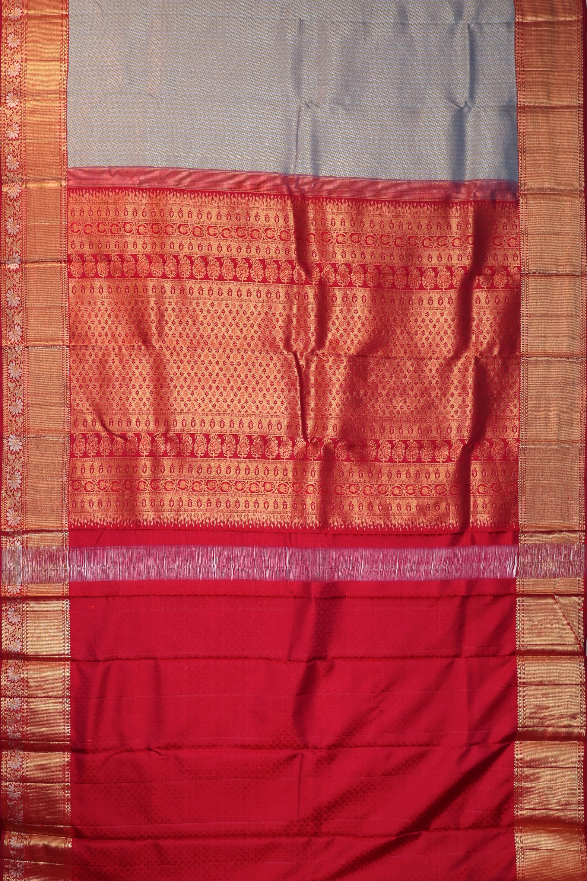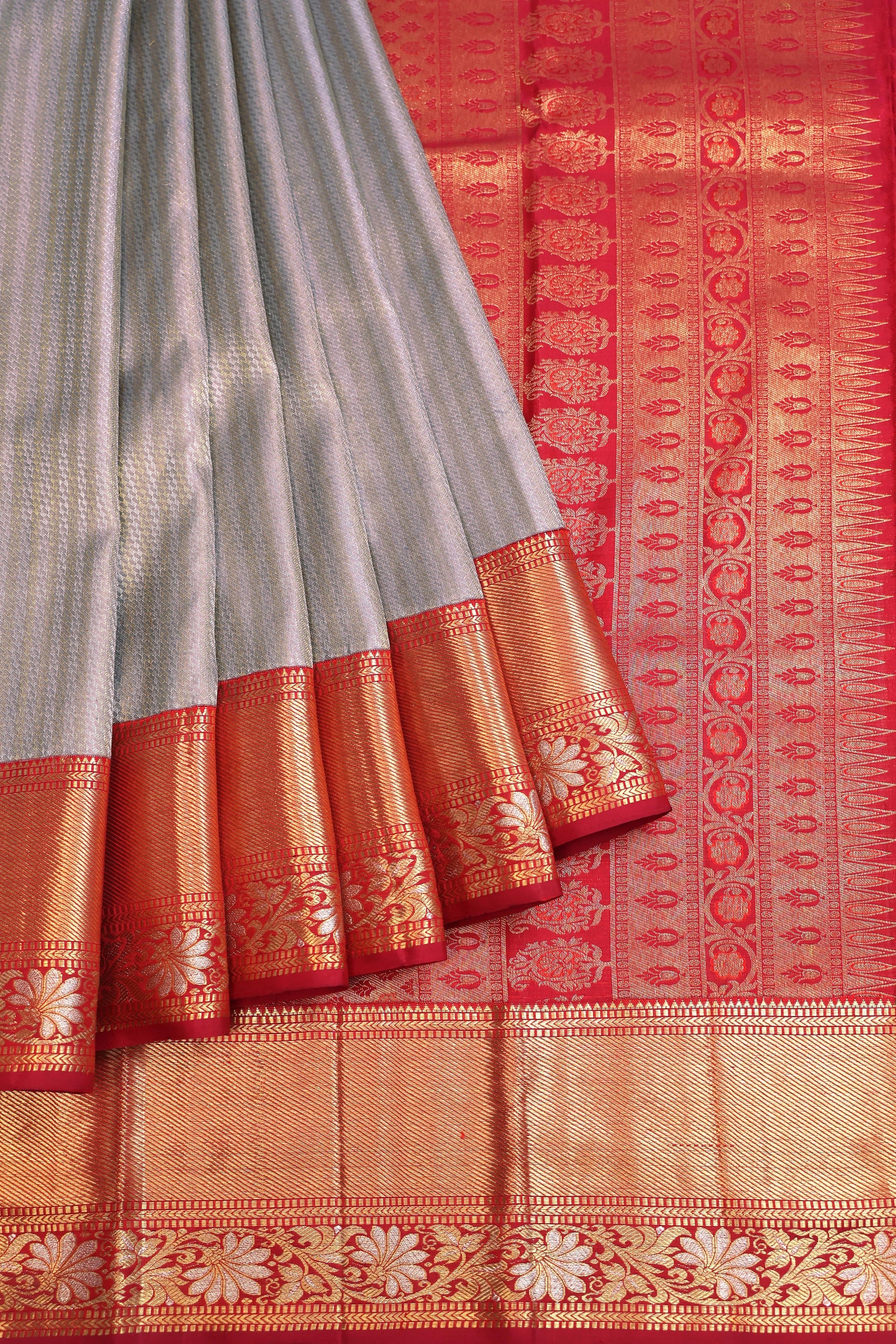 Description - Embrace elegance with this stunning Grey Kanchipuram Silk Saree, beautifully contrasted with a vibrant red border. The intricate floral creeper design along the border adds a touch of nature-inspired charm, while the twill weave enhances the saree's luxurious texture. Perfect for weddings, festivals, and formal events, this saree offers a timeless appeal.