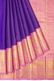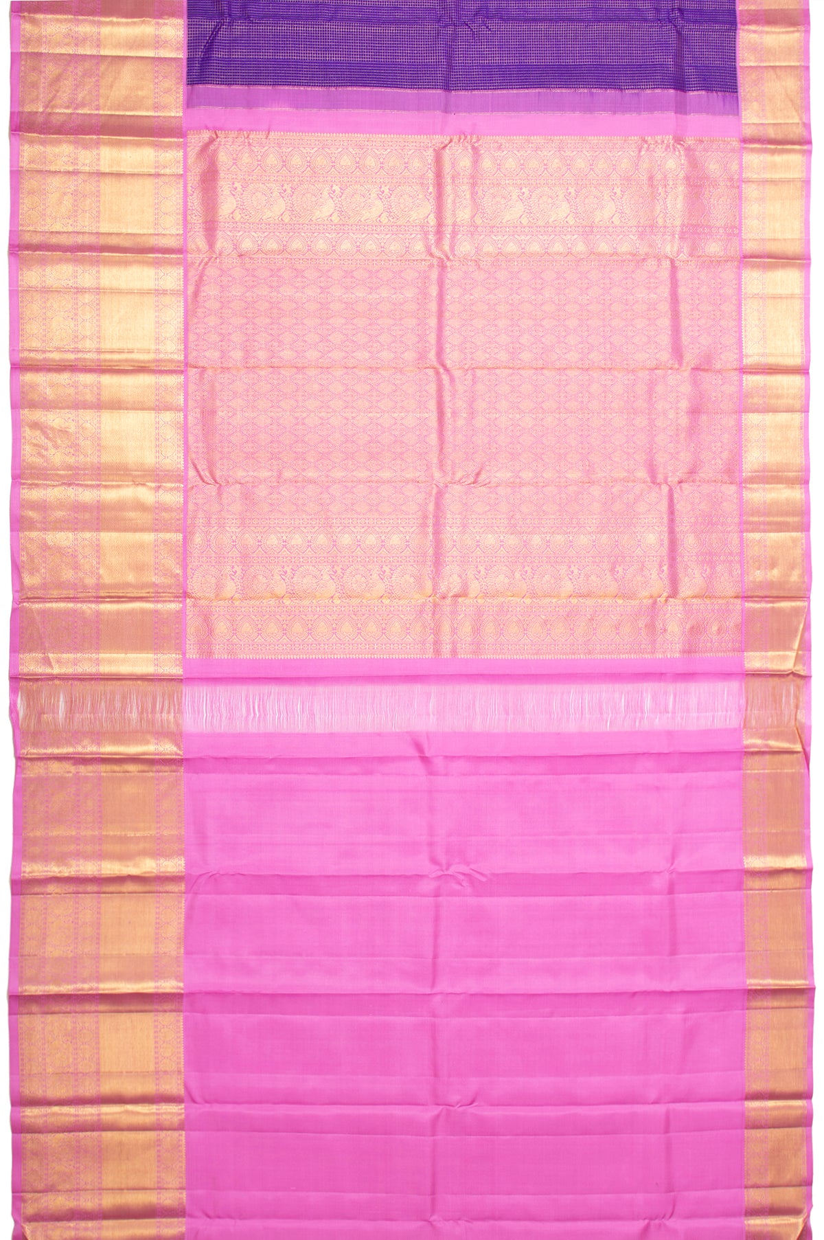 Description - Experience the deep allure of this Indigo Blue Chequered Kanchipuram Silk Saree with a pink border, gold zari kaddi design, and peacock motifs. The pink pallu with diamond butta, paired with a plain pink blouse, is a night sky filled with stars like a midnight elegance.