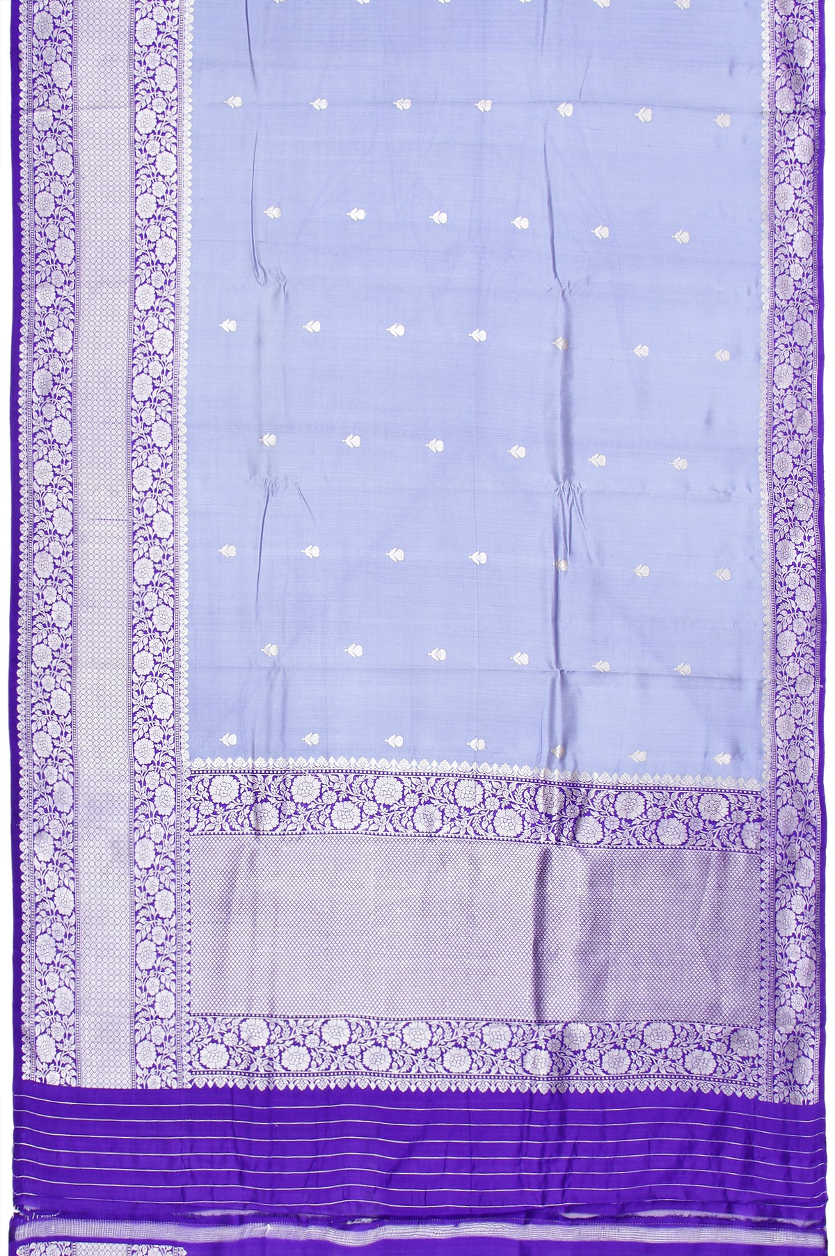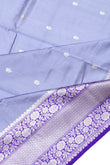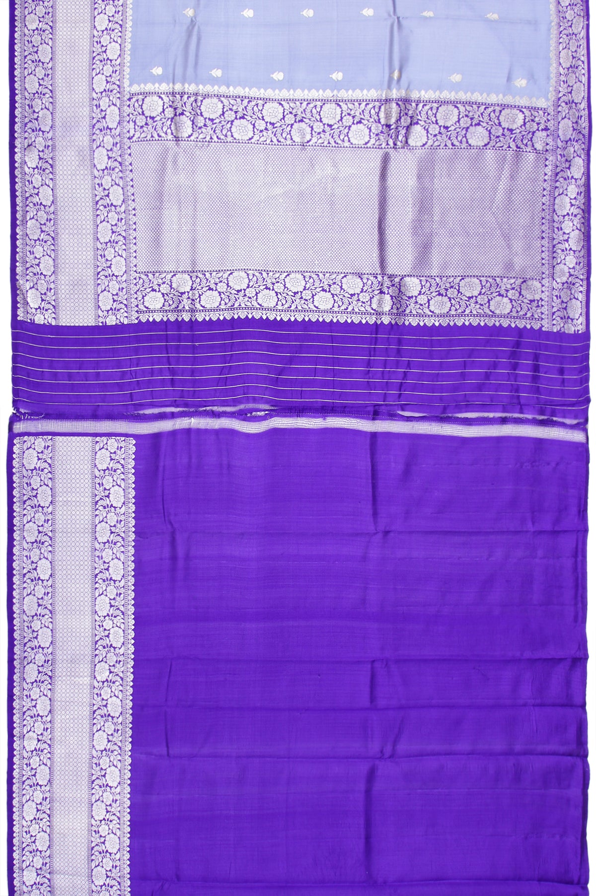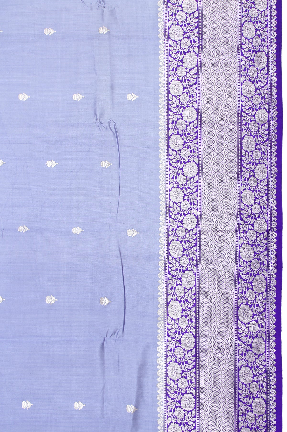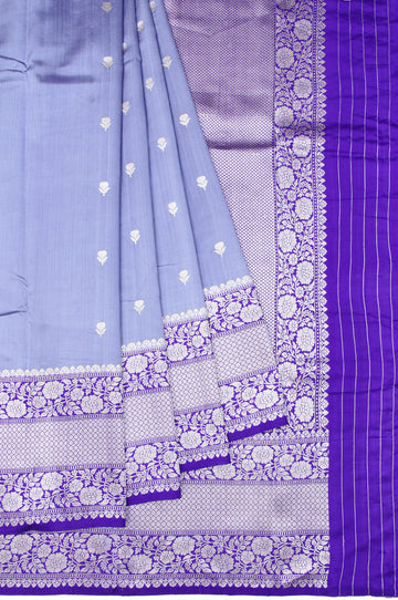Step into sophistication with this Indigo Blue chiniya silk saree, showcasing a stunning border of silver zari floral creepers and flower buttas. The maroon pallu, elegantly designed with silver zari motifs, adds a regal touch to your ensemble. This saree, paired with a plain blue blouse, is perfect for elevating your style at festive gatherings.