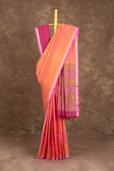 With summer at the threshold, cotton is the most preferred fabric for all women, whether they are professionals are homemakers. This cool and comfort-giving Kanchi Cotton Saree in pleasant peach, goes with the mood of the hour. The piping kaddi border comes with minimal zari while the body displays threadwork. The pink pallu strikes a perfect contrast with checks, diamond butta, flying horse and peacock motifs, and tassels.